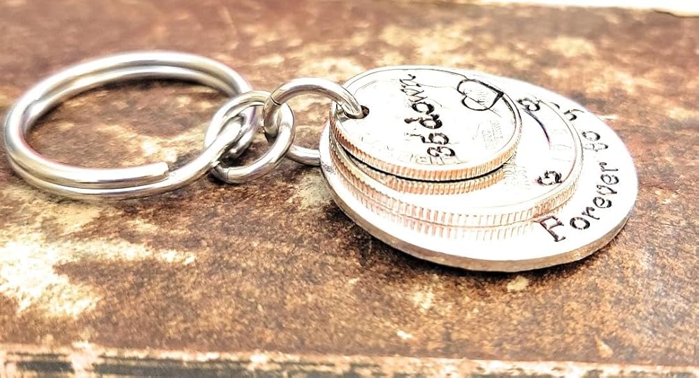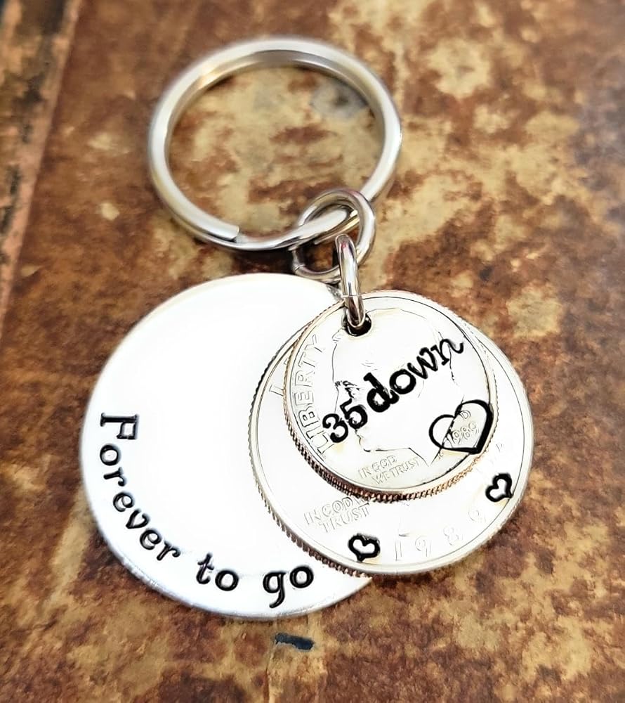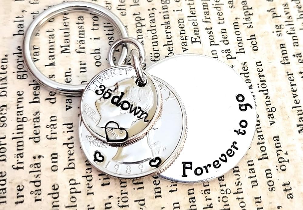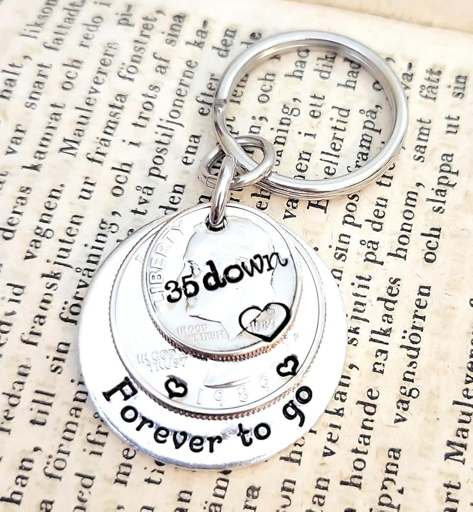 35 Years!! What a milestone! This is the perfect unique gift for the person that has everything. I have hand stamped "35 down" on the top 1989 dime and "Forever to go" on the back aluminum layer. There are also hearts on each side of the year on the quarter and a heart around the date on the dime.Aluminum is a great alternative to the stainless steel pieces I offer. It will not tarnish or change colors and has a lighter weight than stainless steel.