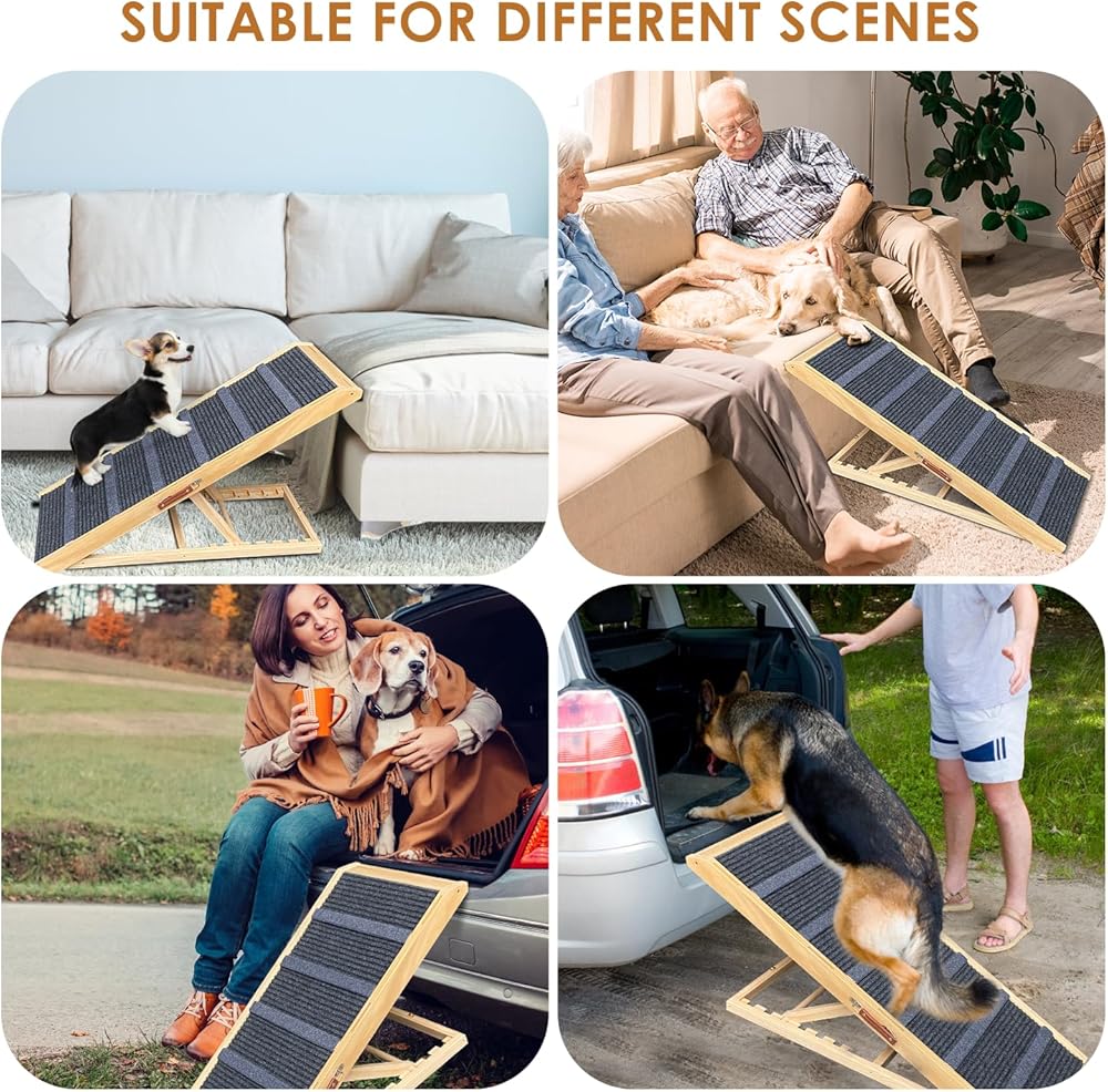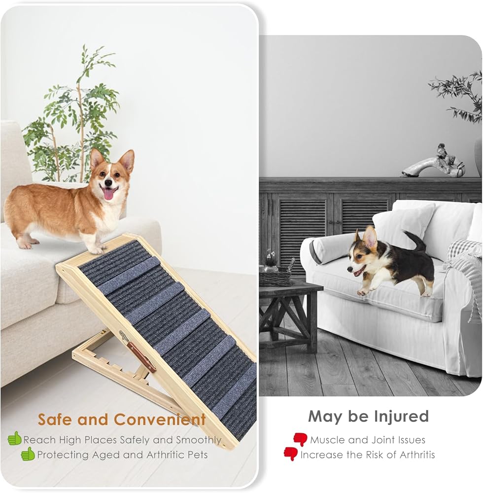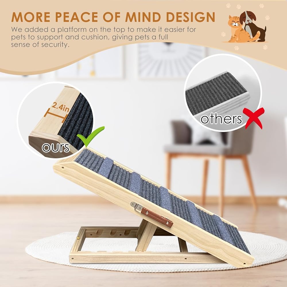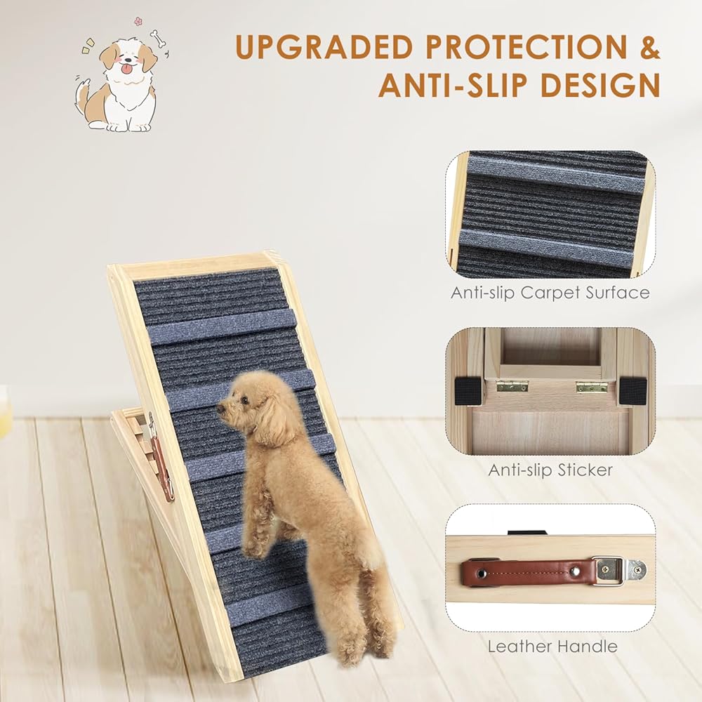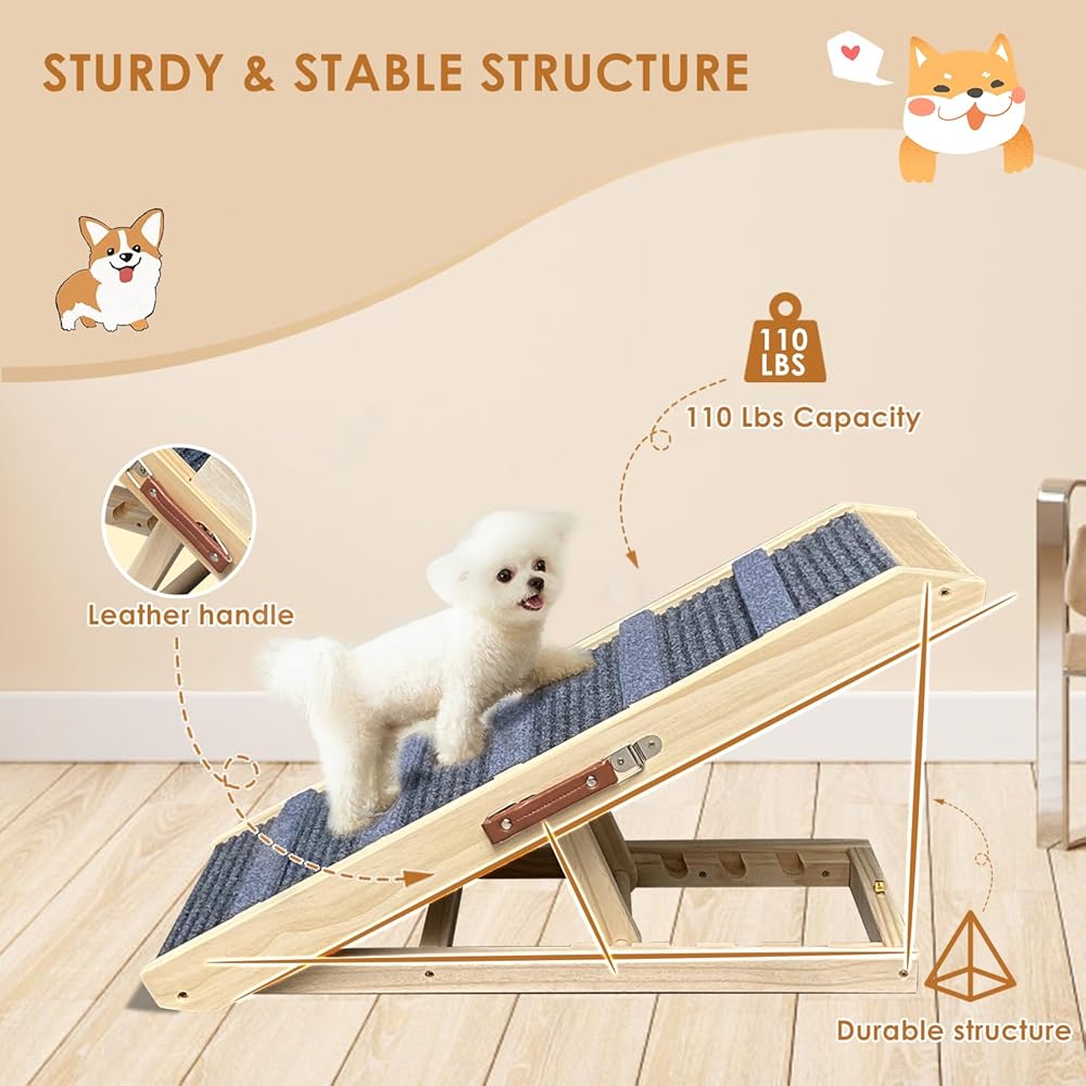 【STABILITY & DURABILITY】The pet ramp is made of high-quality wooden material, which is safe, non-toxic and smooth. The stable square bracket structure and anti-slip strips provide strong support, durable and not easy to shake when in use. Our ramps are independently safety tested and rated to support pets up to 110 pounds, making them suitable for most pet.