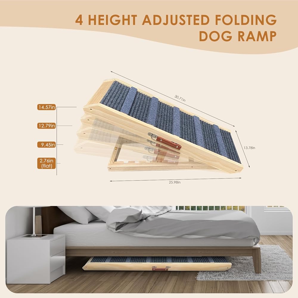 IKARE Wooden Folding Dog Ramp for Bed, 31" Long Foldable Pet Ramp for Small Dogs & Cats, 3 Adjustable Height from 9.5" to 14.6", Small Dog Steps,Cat Ramp for Sofa & Car, Up to 80 Lbs