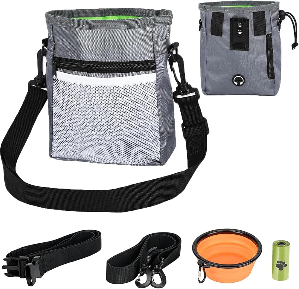 🐾PERFECT KIT: Our dog treat pouch includes 1 treats pouch, 1 travel dog bowl and 1 roll of eco-friendly biodegradable pet poop bag. This is the best pets training kit for you to save your choosing time.