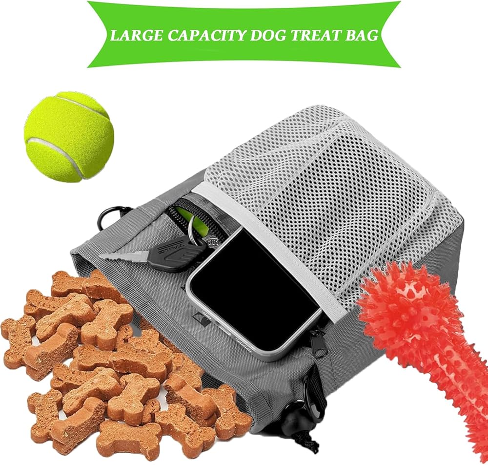 🐾MULTIFUNCTIONALPUPPY TREAT POUCH:The dog walking bag is suitable for small, medium and large pets.The enlarged zippered pocket can hold cell phones, ID cards and more. Side pouches can hold small items, and the waste bag can be pulled out directly through the pre-drilled hole on the back for convenience.The D-ring can also be used to hang keys, dog bowls and more.
