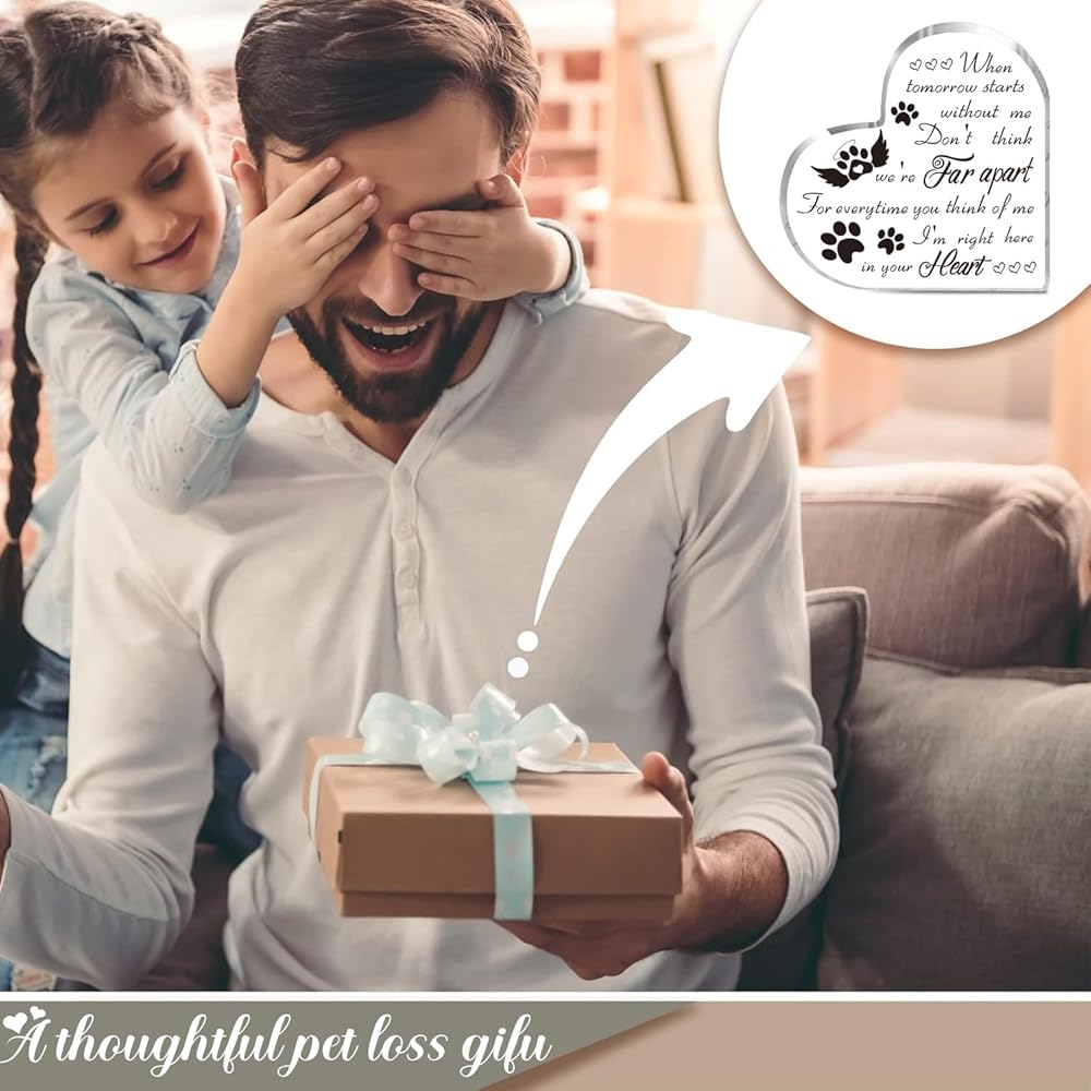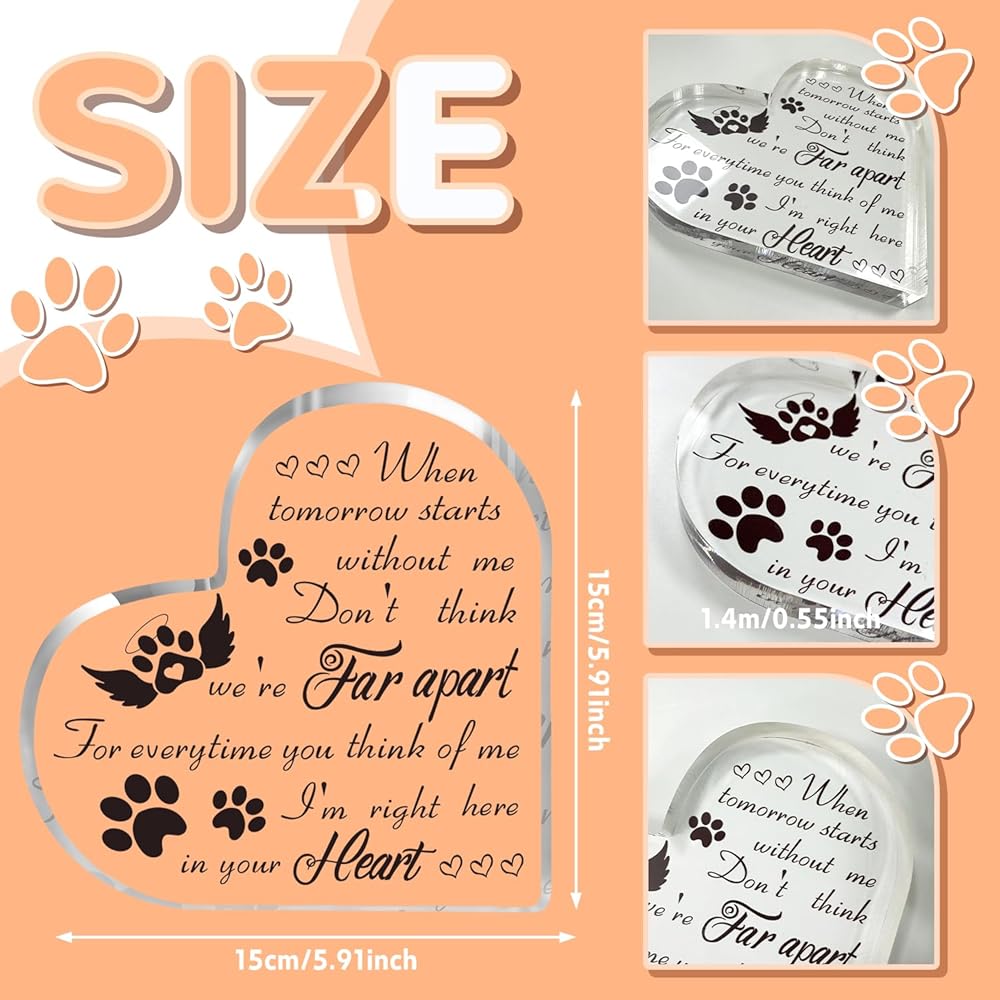 Delicate and Cute Design: The pet memorial gift measures approximately 15 x 15 x 1.4 cm/ 5.91 x 5.91 x 0.55 inches and features a heart-shaped design. It is printed with pet paw prints and hearts, as well as the loving saying, 'When tomorrow starts without me, don't think we are far apart. For every time you think of me, I'm right here in your heart.' This gift shows your concern and care for the recipient's loss.