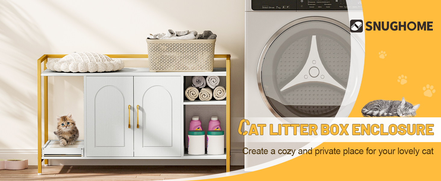 Snughome Cat Litter Box Enclosure, Modern Cat Litter Box Furniture, Hidden Litter Box with Litter Catcher/Storage Shelves, Cat Washroom Cat House Side End Table Entryway Bench for Living Room (White)