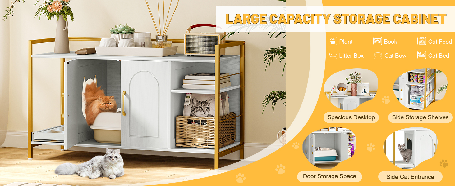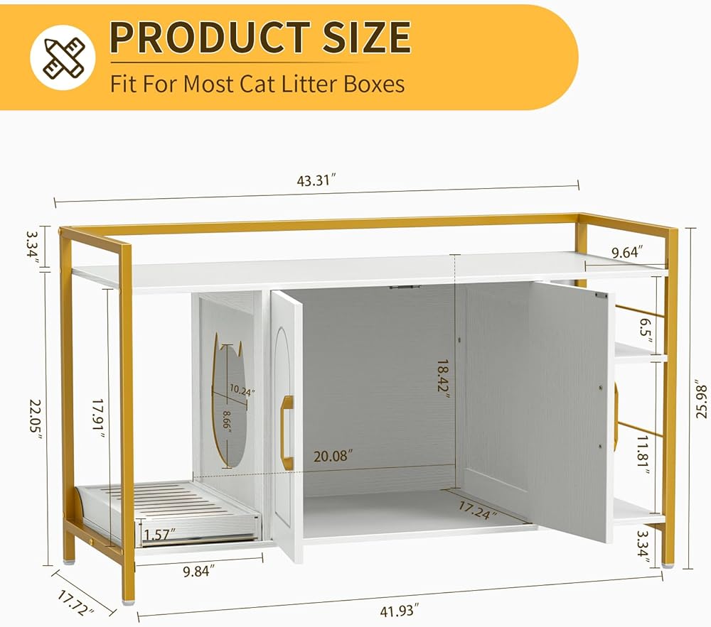 【Ideal Size】: The internal dimensions of the cabinet behind the two doors are 20.08"L x 17.24"W x 18.42"H, making it suitable for most litter boxes. The wide-opening door design allows you to easily place a cat bed and litter box or clean the litter box.