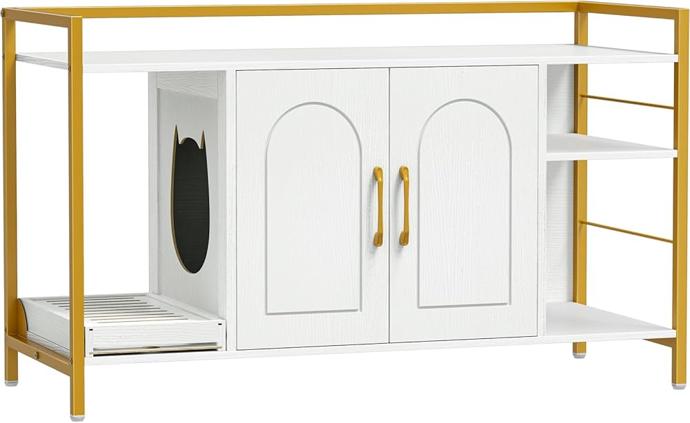 【Sturdy Construction】: The litter box enclosure furniture is constructed with a metal frame and particleboard to ensure long-lasting durability. Adjustable foot pads keep the cabinet stable, and the waterproof surface is easy to clean. The package comes with instructions, included detailed installation steps.