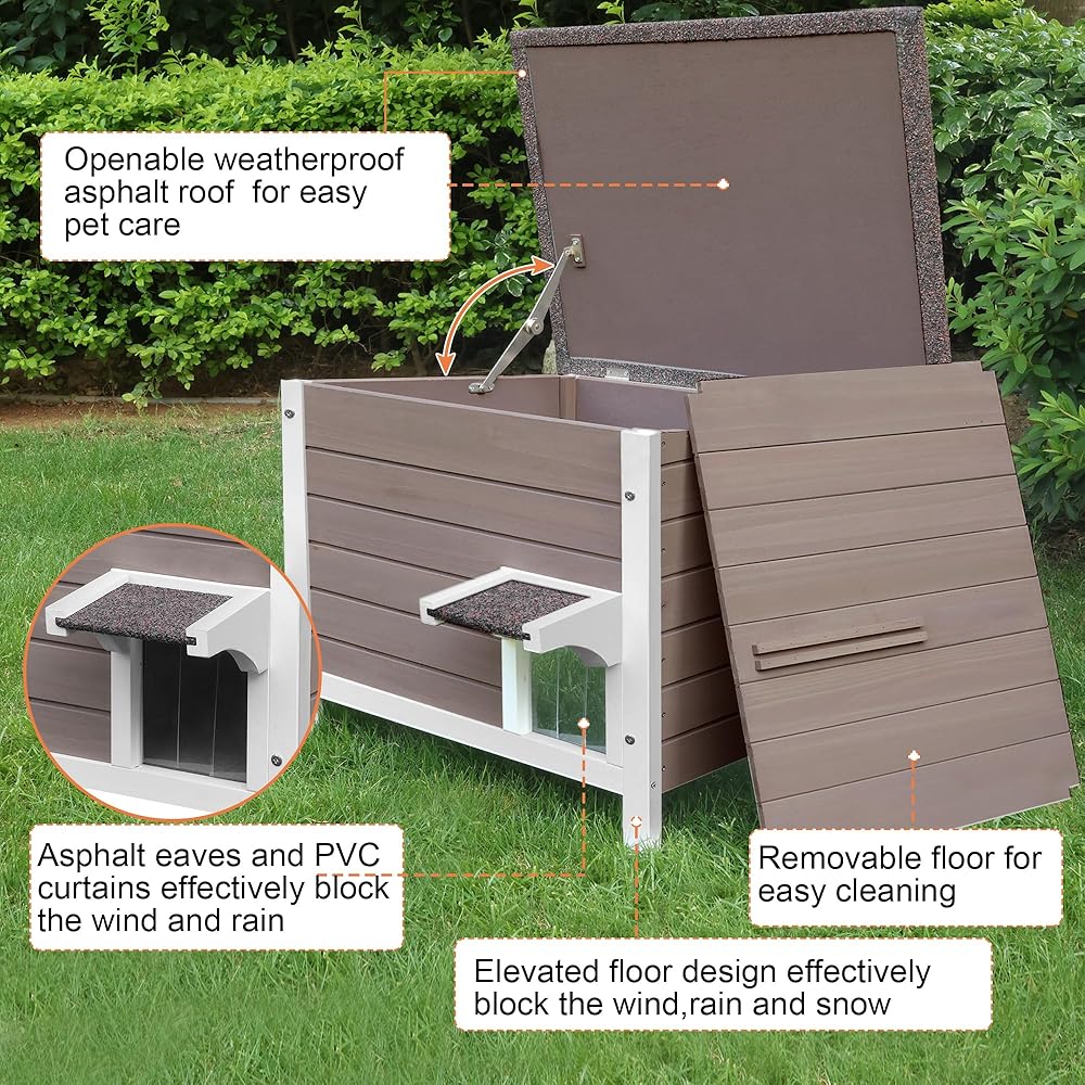 Protect Your Pet From Bad Weather: The weatherproof outdoor cat house has a sloped roof to prevent rainwater from accumulating, asphalt eaves and PVC door curtains to prevent rainwater from drifting in, and a high leg design that effectively protects against moisture to prevent water from entering the cat house.
