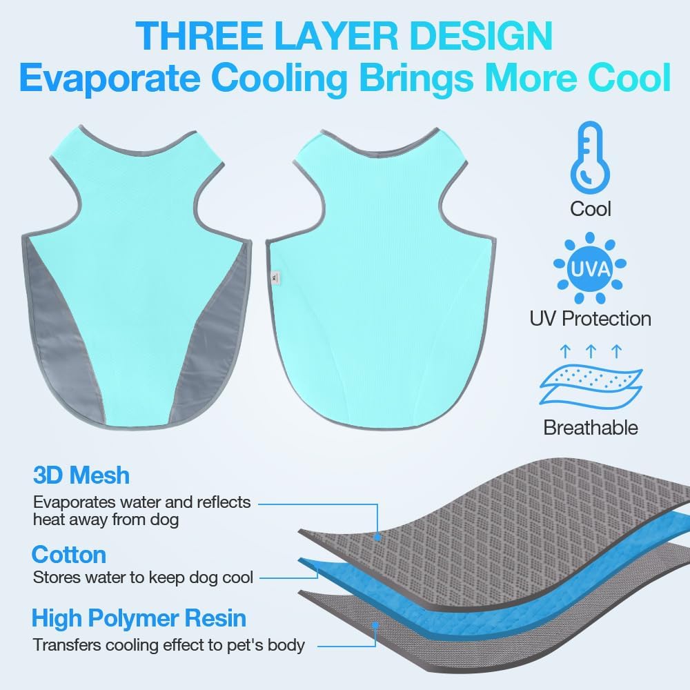 ❄️Lightweight & Breathable Fabric - This cooling vest for dogs has a polymer resin inner layer that absorbs excess heat from your dog's body and an absorbent cotton middle layer that wicks away water to keep your dog cooler for longer. The outer layer is a mesh fabric that increases the area of contact between the fabric and the air for cooler temperatures.