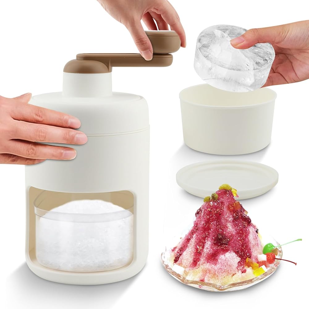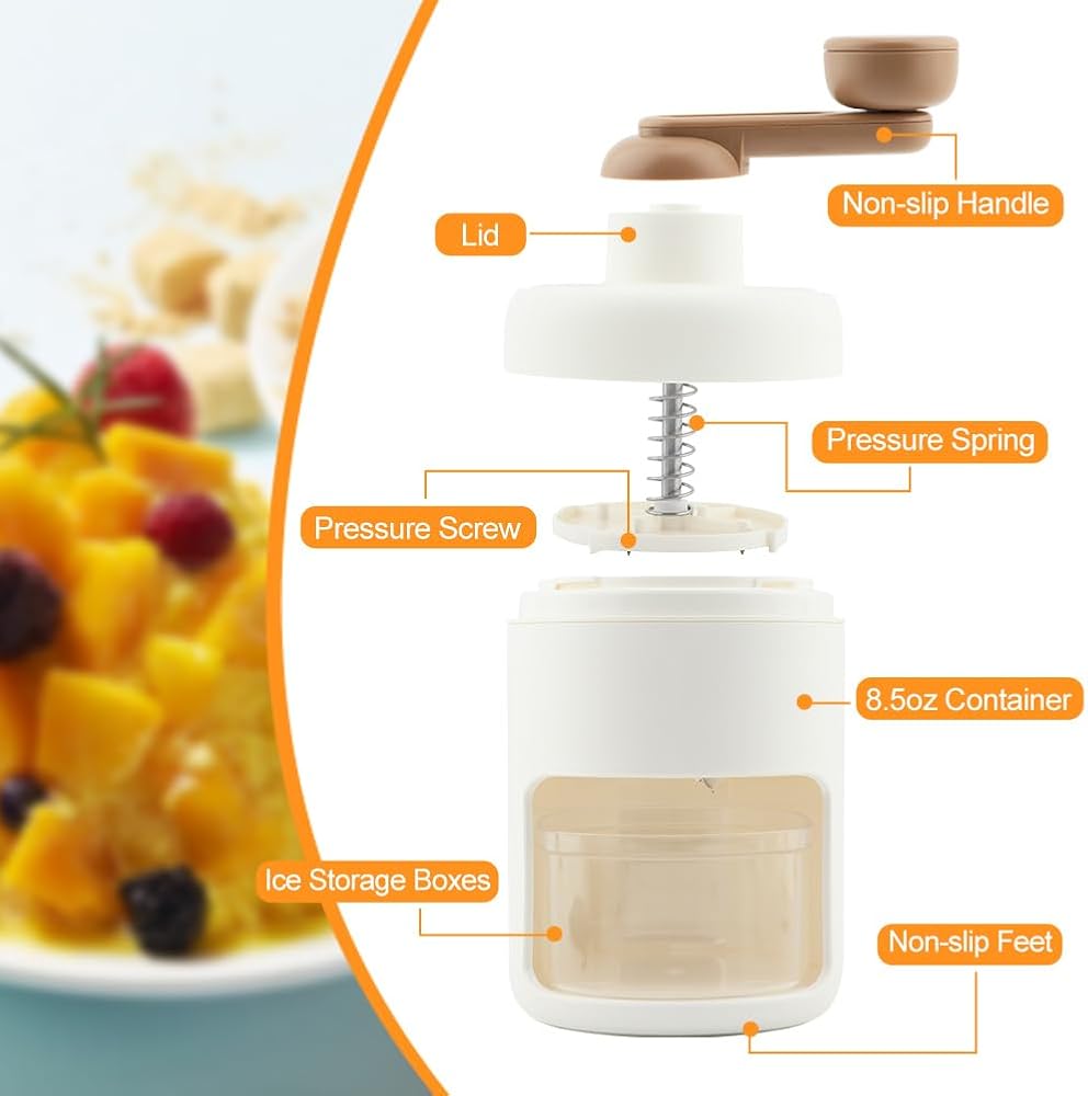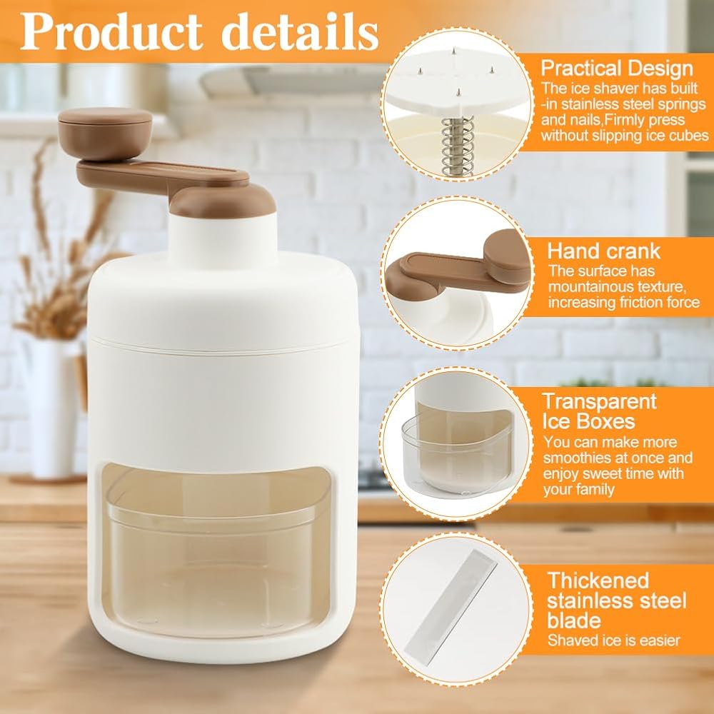 【PRACTICAL DESIGN】The ice shaver has built-in stainless steel springs and nails, which can firmly fix the ice cubes on the blades, and can quickly and smoothly make the ice cubes into even, delicate and delicious smoothies. The bottom of the ice crusher has a rubber ring to prevent slipping during the ice crushing process, making it safer to use.