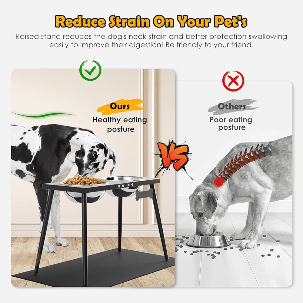 【COMFORTABLE HEIGHT】This dog bowl stand is 17 inches tall, allowing dogs to eat in a natural standing position without excessive bending, which is especially beneficial for older dogs with joint problems or mobility issues, and helps to alleviate the burden on their necks and backs.