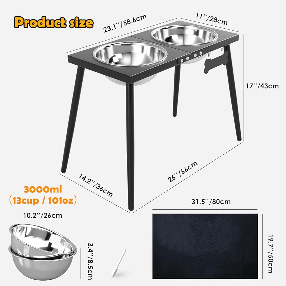 【FOR MEDIUM & LARGE DOGS】The elevated dog bowl is designed for large and giant dogs, the bowl stand is about 17 inches high from bottom to top, perfect for medium and large breeds, the large capacity of 3000ml can also meet your dog's daily dietary needs and reduce the hassle of filling the bowl frequently!