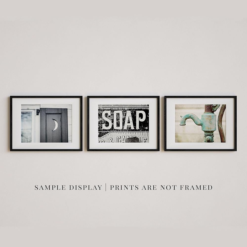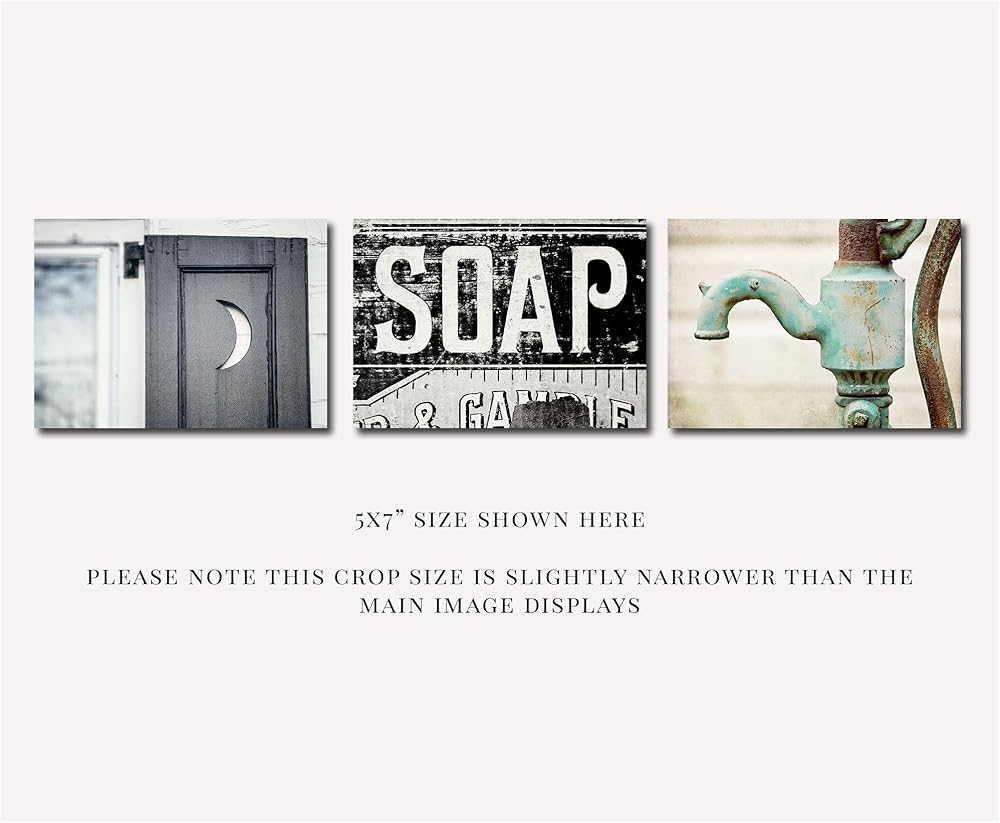 Lisa Russo Fine Art - Rustic Bathroom Wall Art Set of 3 SMALL 5x7" Prints - Unframed - Country Farmhouse Bath Decor - Teal, Blue, Black - Soap, Outhouse Moon, Water Pump