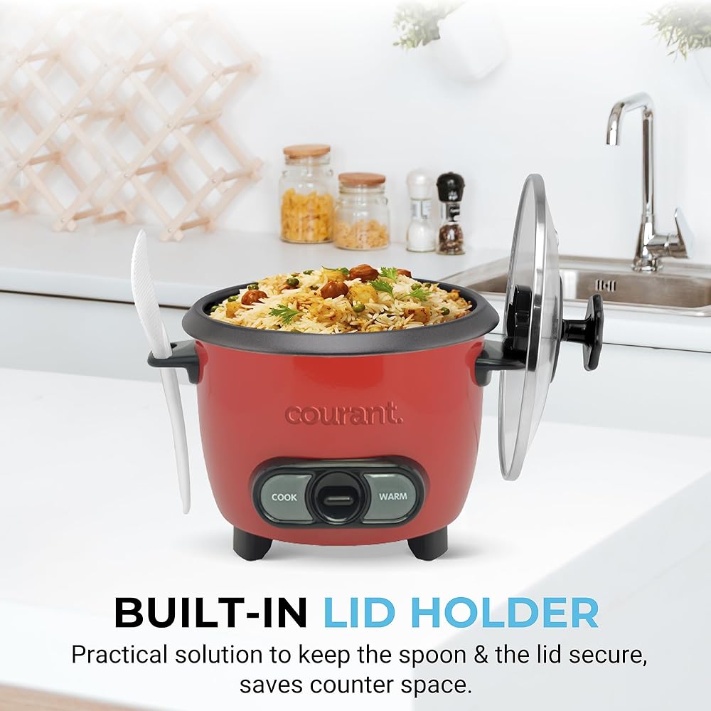 Check out the Courant CRC-0410 Rice Cooker, your go-to appliance for perfectly cooked rice every time. With a 8-cup capacity, it effortlessly prepares up to 4 cups of uncooked rice, yielding fluffy, delicious results. Easy to use with one-touch operation and automatic keep warm function, it's equipped with cooking and keep warm indicator lights for convenience. The non-stick removable cooking bowl features precise measuring lines, while the easy-view tempered glass allows for convenient monitoring. Its built-in lid holder saves counter space, and the steam vent ensures even heat distribution. Plus, accessories like a measuring cup and spoon are included for added convenience. Simplify your cooking routine with the Courant Rice Cooker.