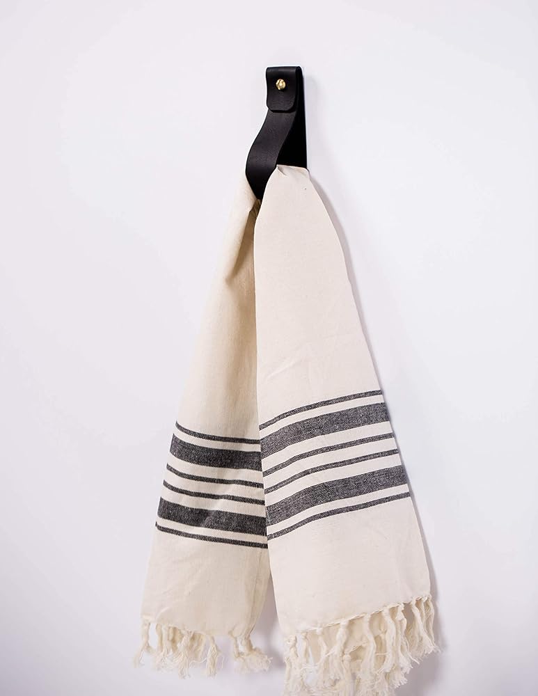 Leather straps are very durable. They are a great way to keep your home, office, or craft space organized and clean. They can be used in a wide variety of ways, you can use just one as a towel hanger in kitchen or bathroom. Use two of them spaced apart with a dowel, drift wood or tree branch looped inside to hang larger items like towels, fabric storage or even use as a curtain rod hanger.