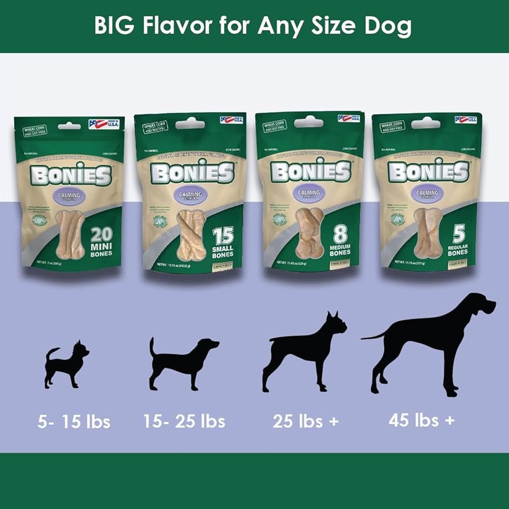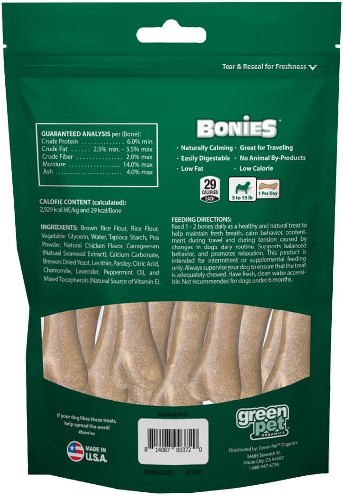Bonies All-Natural bones are unique treats that use all-natural ingredients to promote fresh breath. Each ingredient is carefully selected by our board-certified animal nutritionist to ensure safety, enjoyment and digestibility while benefiting your dog's health. Bonies contain zero saturated and trans-fat without any animal by-products such as gelatin and animal glycerin. Reward your four-legged friend with BONIES Calming Formula Medium Dog Treats–a tasty natural snack that also benefits his health. Firm texture helps remove plaque and tartar as he chews to maintain good dental health between brushings. This unique calming chew is made from 100% all-natural ingredients including brown rice, chamomile and lavender to help ease nervousness and anxiety. These fully digestible treats contain absolutely no wheat, gluten, corn or soy so they won't upset sensitive tummies, and no animal by-products like gelatin or animal glycerin. The paw-sitively irresistible natural chicken flavor will keep him chewing to help scrape away plaque and tartar to maintain good oral hygiene between brushings.