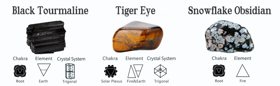 Gemstone Properties: Snowflake obsidain is a stone of purity, Snowflake Obsidian provides balance for body, mind and spirit. Black Tourmaline can be used to block, repel, and protect against negativity. Tiger eye gives you the courage and confidence to face whatever is coming your way.