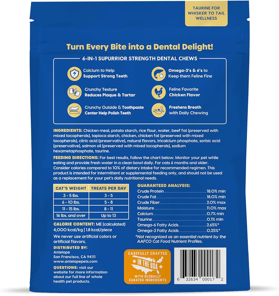 Turn every bite into a dental delight with Ark crunchy cat strengthening dental chews with 6-in-1 su-purr-riour strength dental chews. Calcium helps strengthen teeth with a tasty toothpaste center. The toothpaste center is made with SHMP to ensure efficacy. The crunchy texture helps reduce plaque and tartar, plus freshens breath with each treat. Elevate your cats dental care with these simple effective treats.