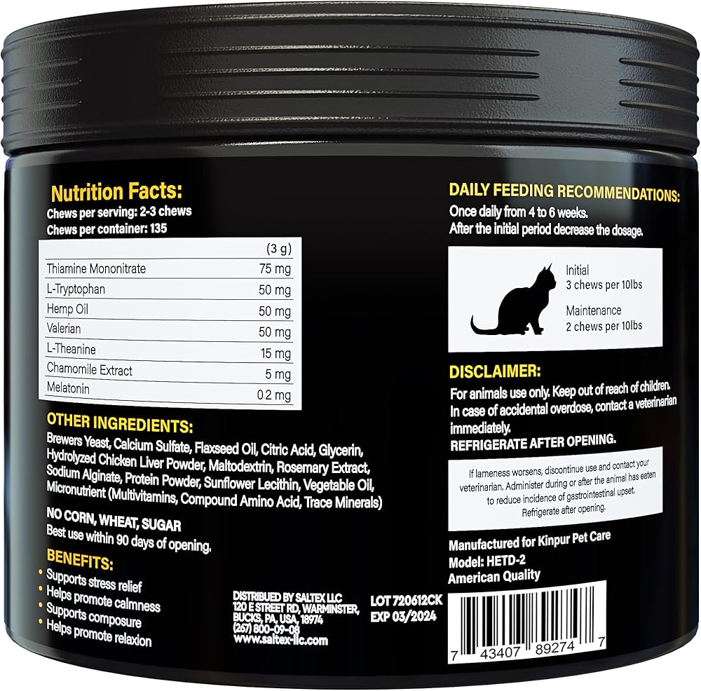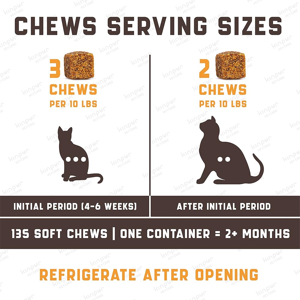 Stress-Free Moments: Our calming cat chews help your pet adapt to changes quickly and reduce signs of discomfort like scratching, biting, peeing, and trembling. A great way to keep your cat serene and relaxed.