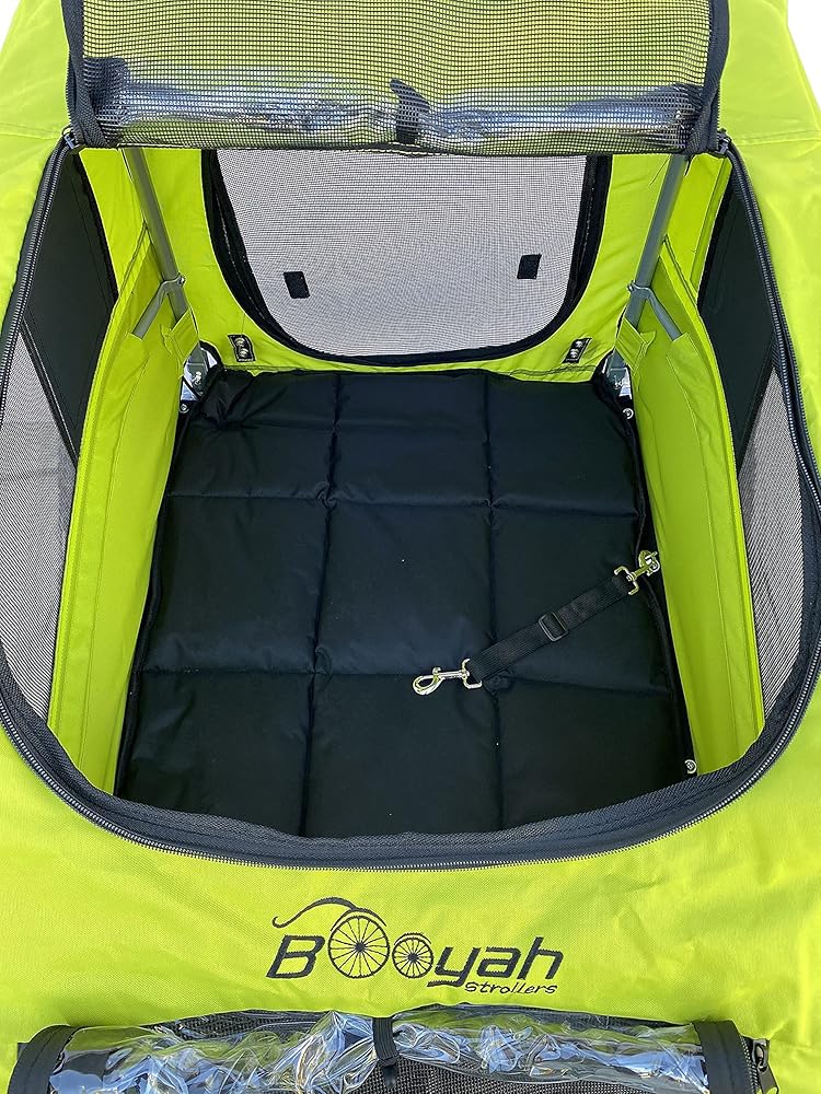 Front and rear entrances, adjustable handlebar, lockable swivel wheel, bike trailer arm and hitch that swings out from underneath. 3 layer sunroof. Dimensions: Inside: 36 L x 24 W x 22 H. Please see that your pet will fit within these inside dimensions. Outside: 52 L x 33 W x 36 H Folded (stroller only) with wheels removed: 40 L x 28 W x 7 H