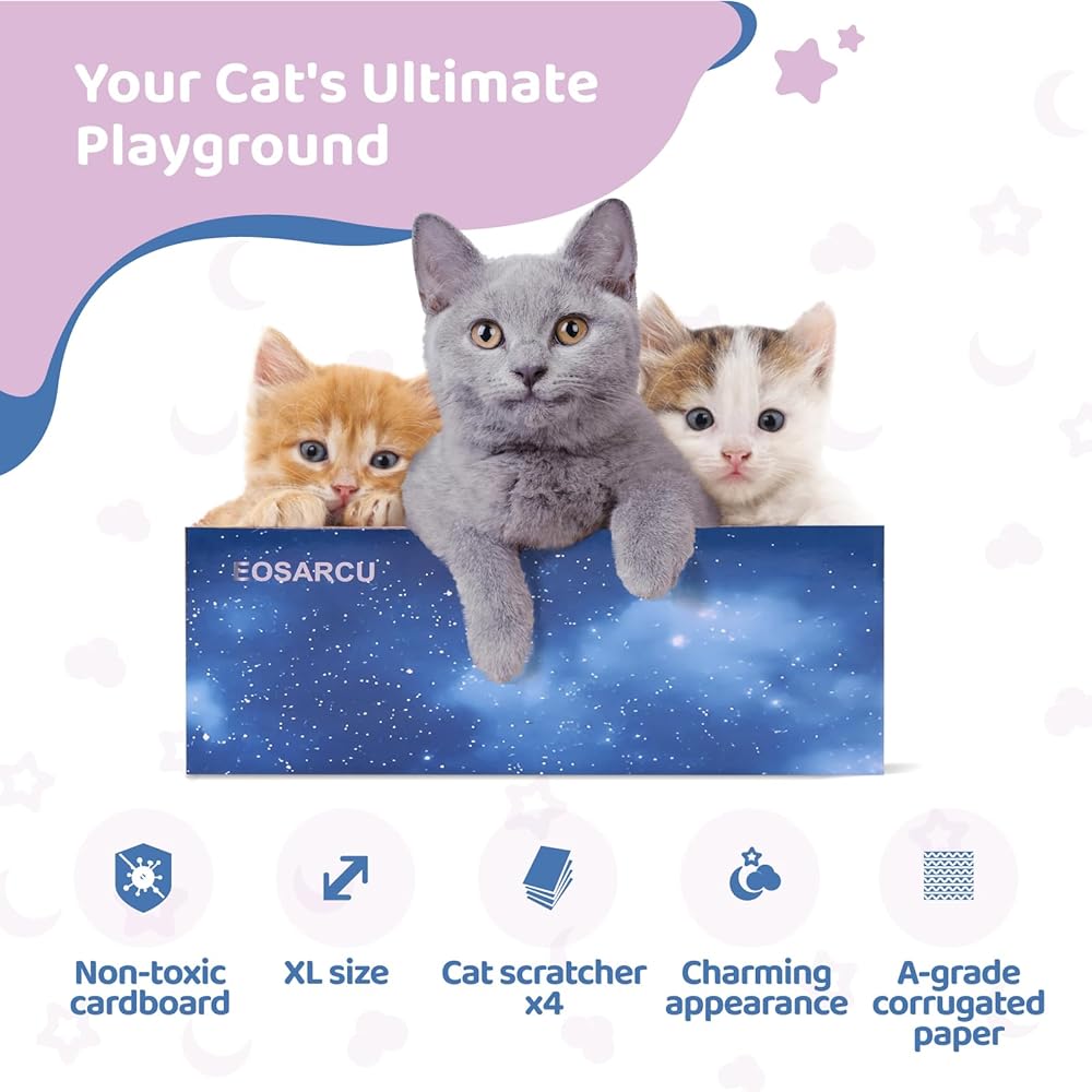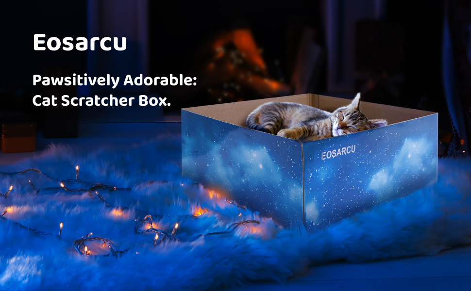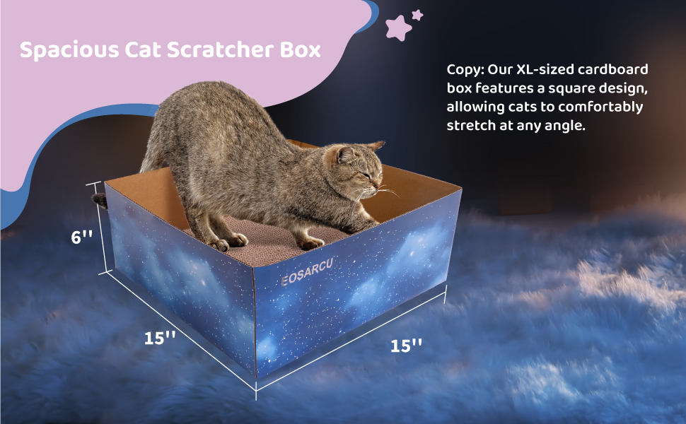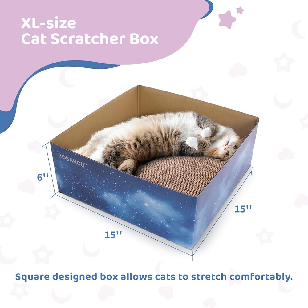 😻【Stylish Design & Versatility】Featuring a mesmerizing blue starry sky pattern, this cat scratch box invites cats to play and explore. But there's more to it than meets the eye – Eosarcu cat scratch box doubles as a cozy cat bed! Its versatile design seamlessly integrates into your home decor while providing a comfortable space for your feline companion to rest and relax. With its attractive appearance and multifunctional use, the Eosarcu Cat Scratch Box is the perfect addition to any cat lover's home.