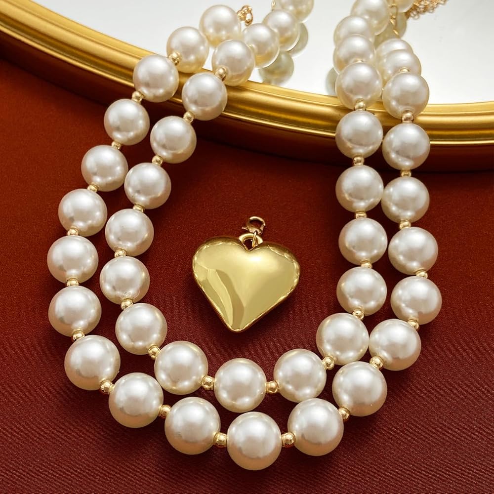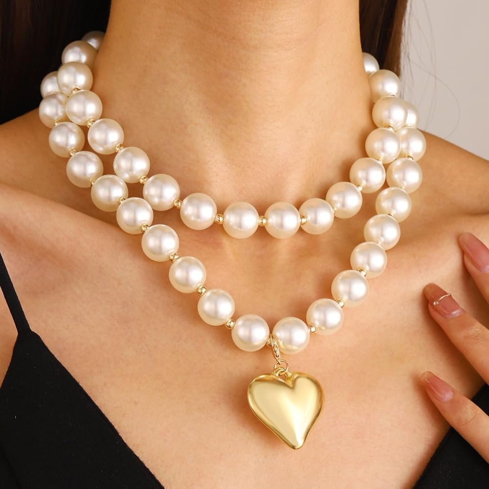 Gold Heart Necklaces and Bracelet Set for Women Chunky Puffy Heart Choker Necklace Big Heart Pendant Pearl Necklace Trendy Prom Jewelry Y2k Accessories