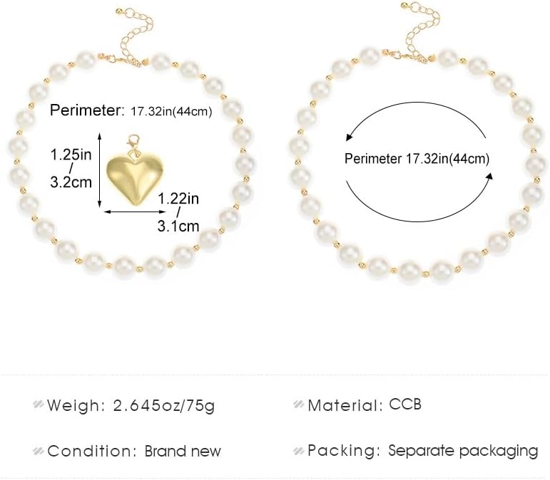 Heart Beads Necklace Set: The size of these Chunky Beads Pearl Necklace: the necklace is 15.7 inches long, the bead is 0.31 inches in diameter, and the heart is 0.98 inches wide. The length of the bracelet is 6.2 inches and the width of the heart is 0.78 inches.