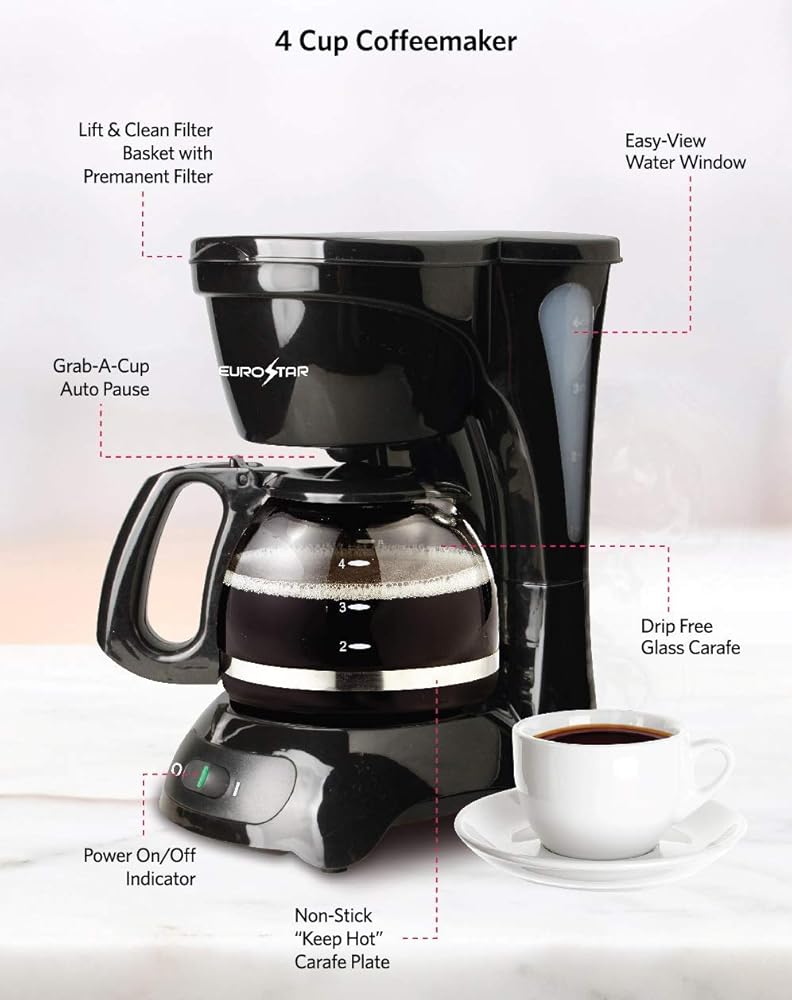 The Eurostar 4-Cup Coffee Maker helps you make rich-tasting coffee without stress or mess. The Auto Pause is a lifesaver. It stops brewing so you can pour freely, and then finishes the brewing cycle after you place the carafe back in position. It also features a removable basket filter that lifts out for quick and easy filling and cleaning. Item Dimensions 8 x 7 x 10 inches