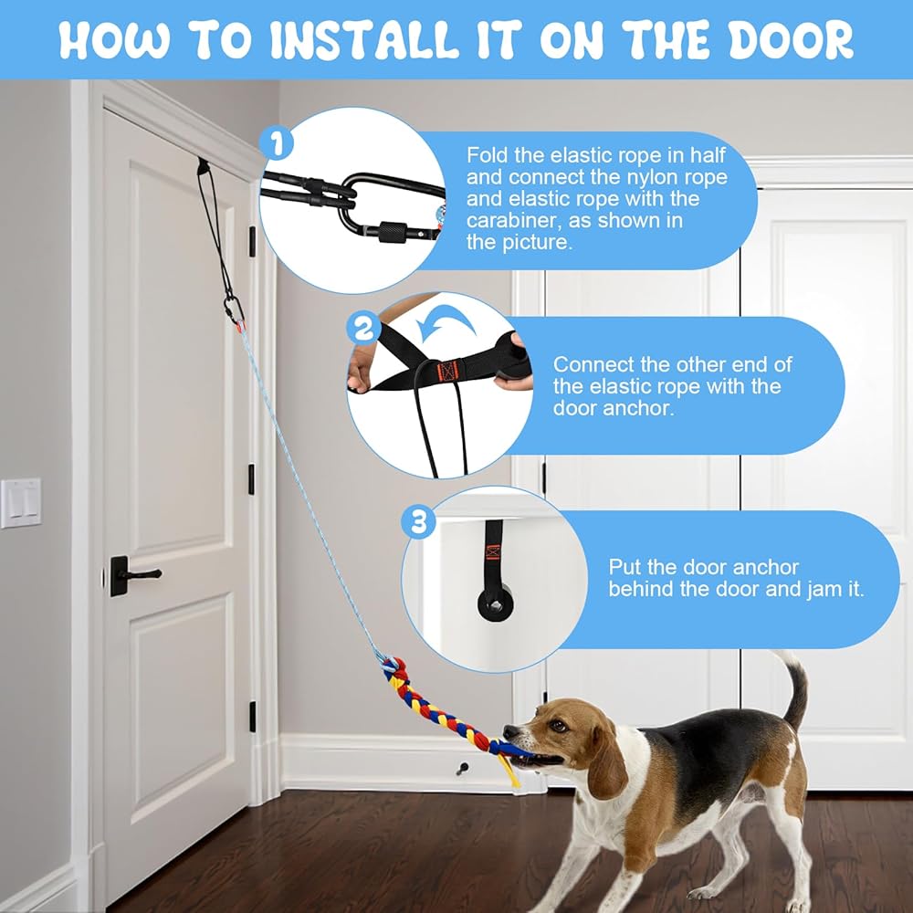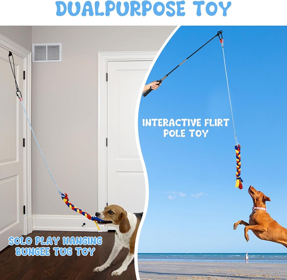 Dual-use dog toy--When you want to interact with your dog, it can be used as a flirt pole toy, to guide the dog to chase, bounce, and tug of war. Fully mobilize the enthusiasm of your dog. In addition it can be used as a indoor hanging dog tug of war toy, allowing the dog to play alone until their energy is released.