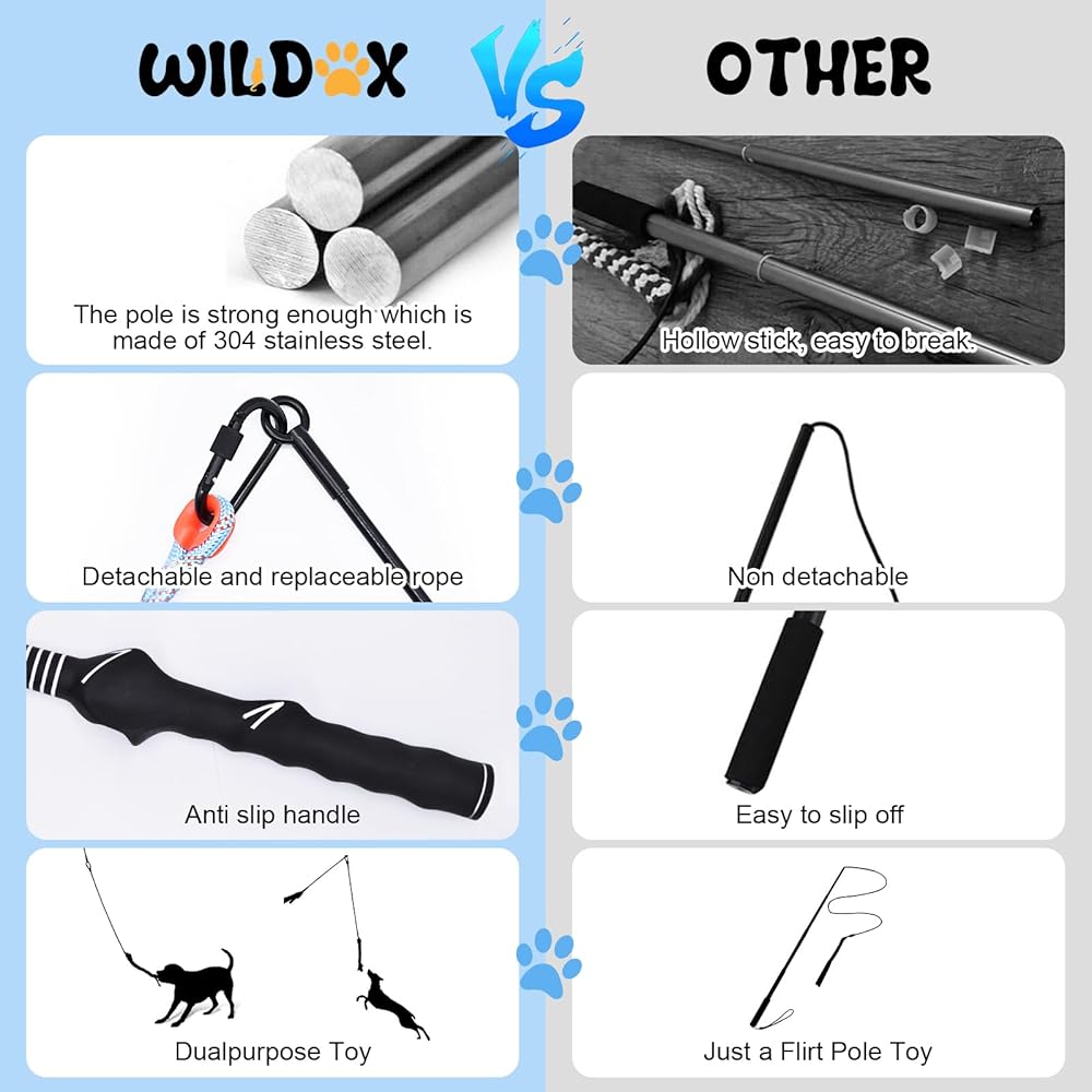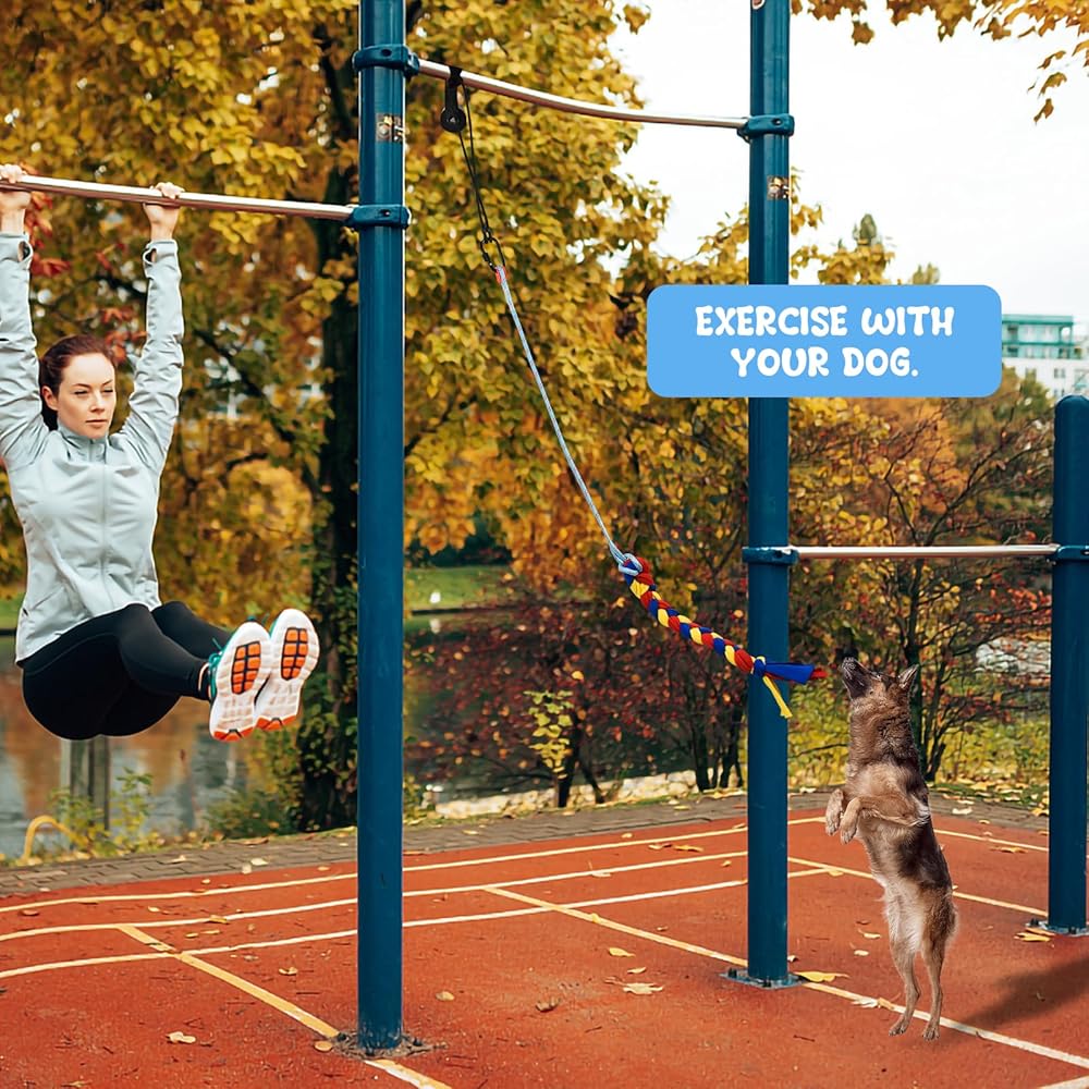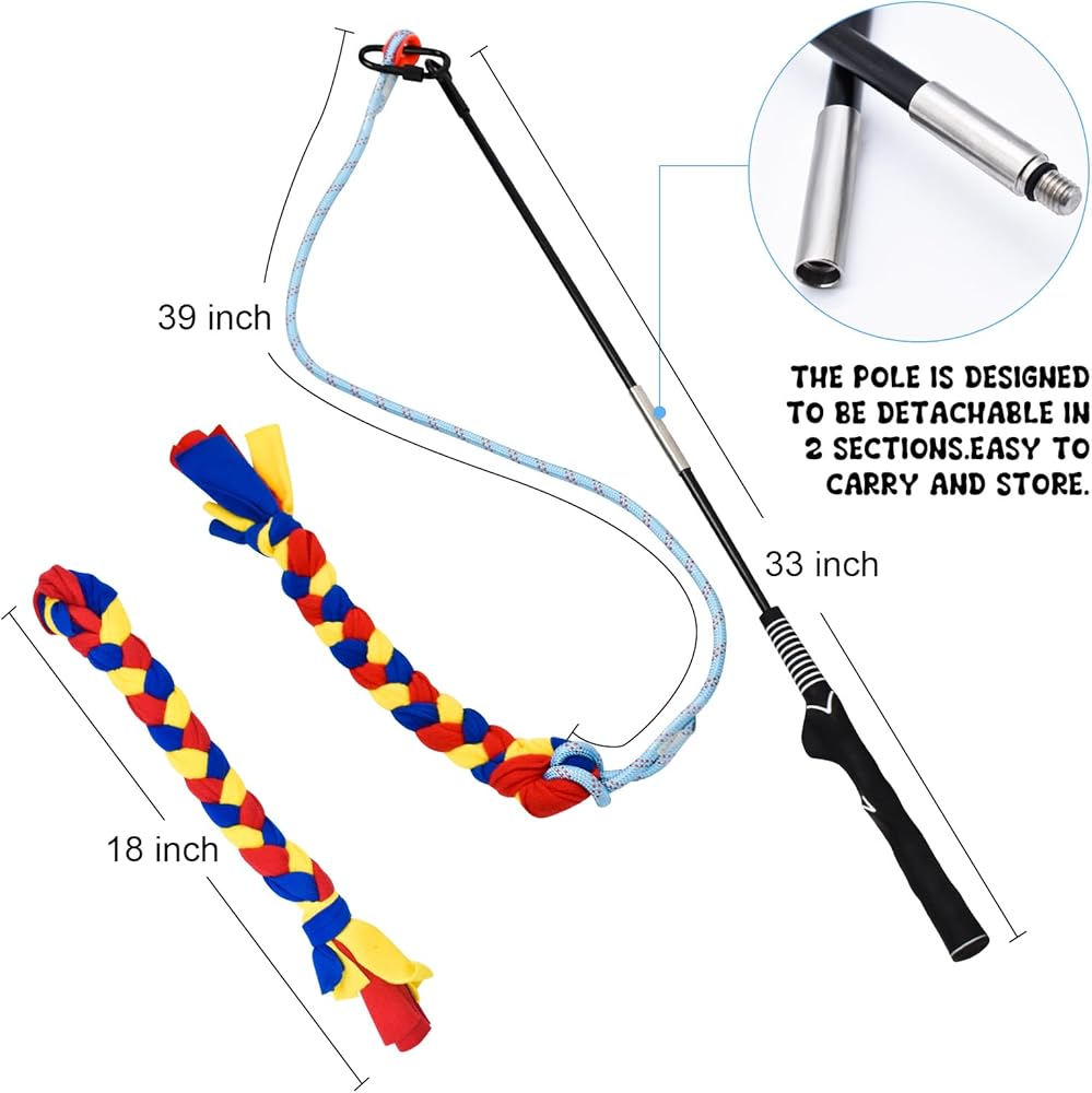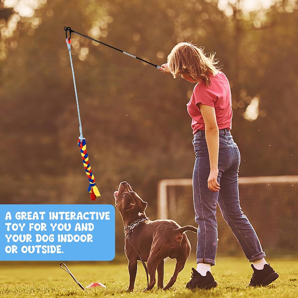 Fun and Effective Exercise--Our flirt pole for dogs is the perfect tool for exercise and training. It works by tapping into your dog's natural hunting instincts, encouraging them to sprint, change direction, and leap to catch the lure. This makes it ideal for small to large pets who like to chase and play tug-of-war.