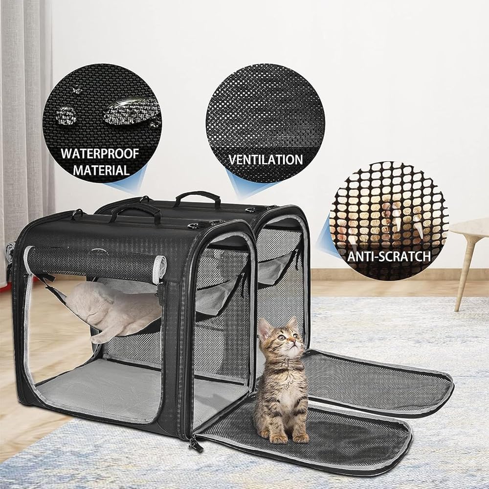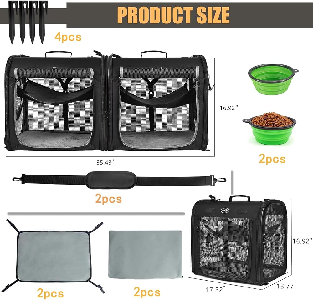 【Premium Materials and Comfort】The double pet kennel is made of high-quality 600D Oxford cloth material, which is easy to clean, wear-resistant and durable. Breathable mesh material on 4 sides ensures air circulation, providing comfort, coolness and easy vision. Hammock and cushions at the bottom provide extra comfort.
