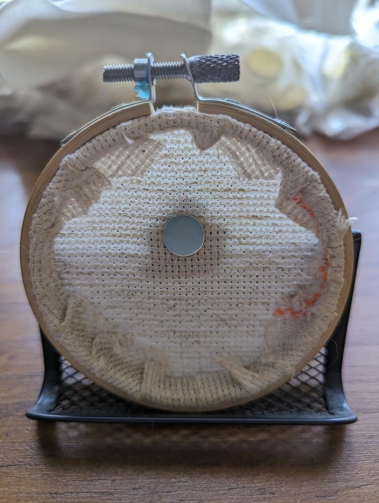 • he needle minder comes with two magnets, one attached to the back, and one to hold it down onto your fabric from the back. Simply chuck your needle down whenever you need to take a break and the magnet will hold it down for you