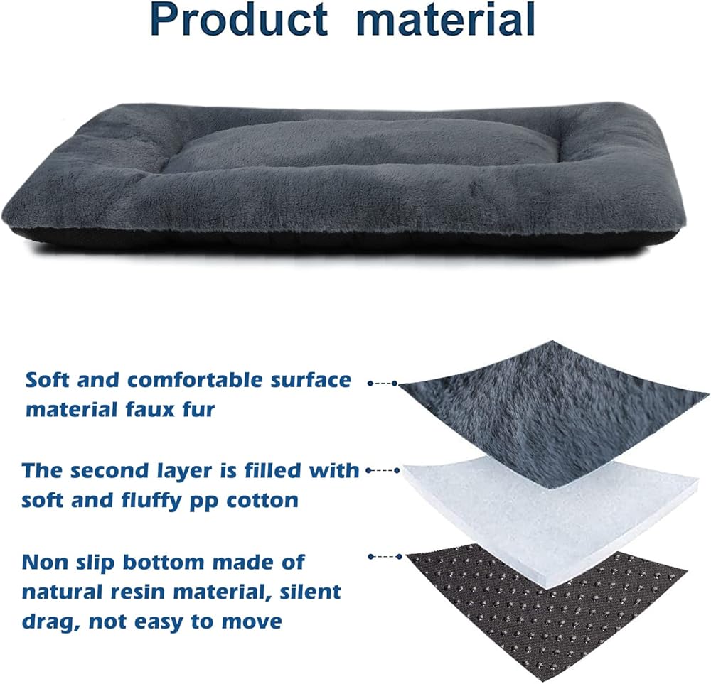 Dog bed for crate soft calming fit:This dog cage bed brings soft sleeping enviroment for your dog when sleep inside the hard dog cage .Adopt super soft faux fur material to provide your pets a comfortable sleeping experinence.This dog pad can also help them ease anxiety and protect their joint well.This pet bed fits perfectly in a crate, on the floor or wherever you choose