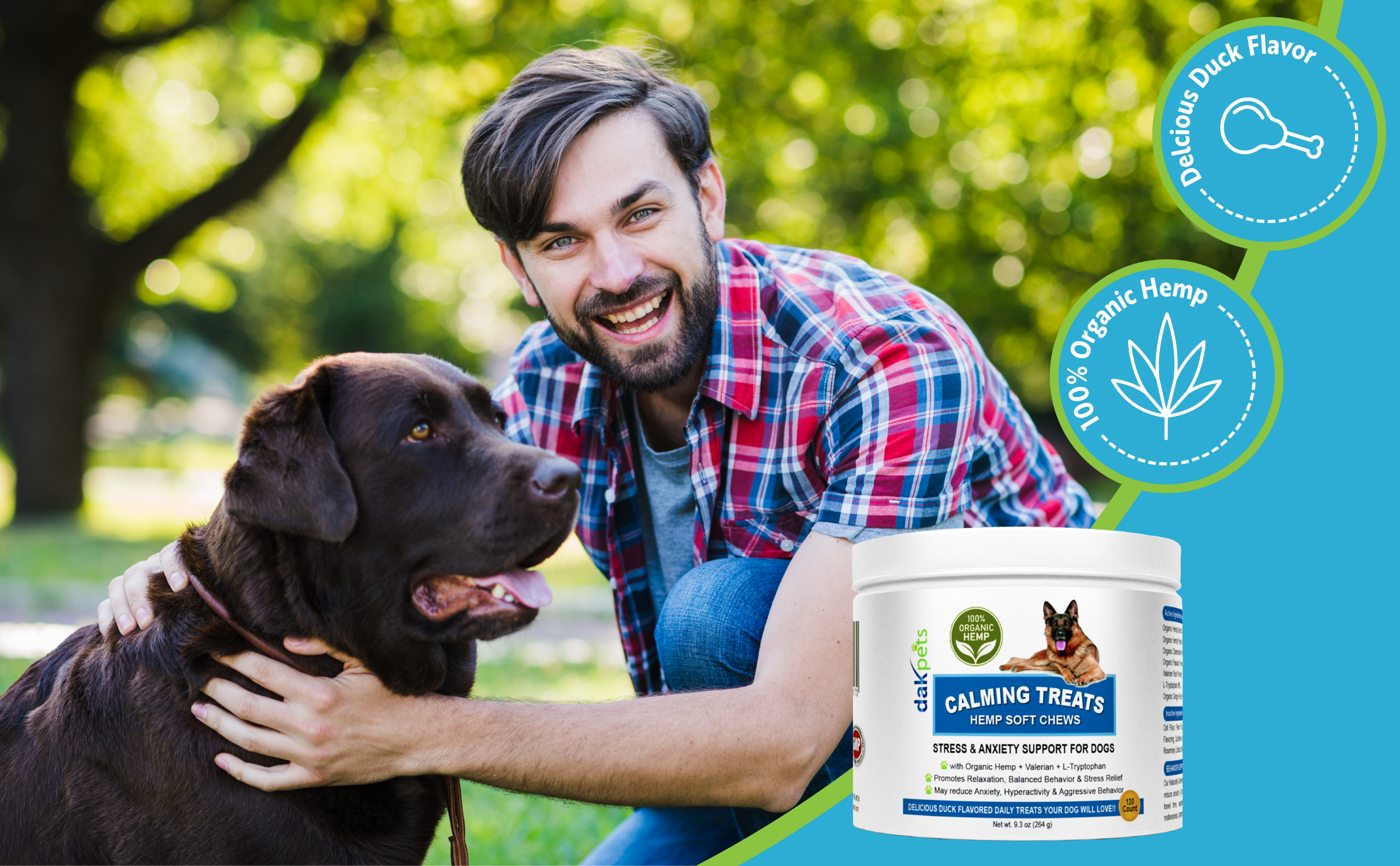 Natural Calming Aid Helps Soothe Anxiety: DakPets Calming Treats – a duck flavored chewable supplement formula with both natural and organic ingredients that can help dogs of all breeds,sizes and ages relax in any situation. These natural calming aid treats can help support your pet by keeping them calm and at ease whether it's anxious and nervous behavior or just a slightly aggressive temperament.