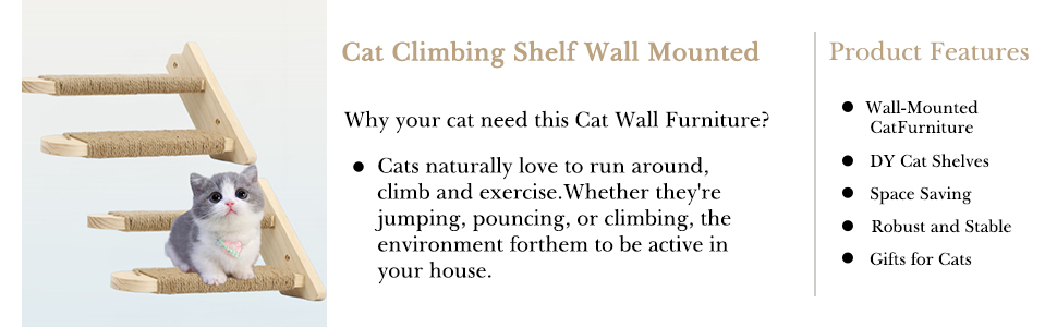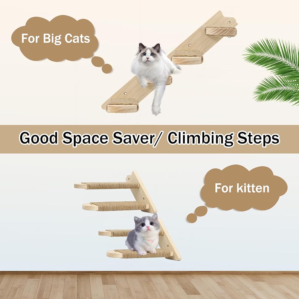 【SAFETY AND WITHSTANDS PLAY】Our shelf material is made of 100% radiata pine wood.Can carry cats,good stability, high safety and no risk to your cat. The rope on the stairs can improve the friction and not easy to slip.The cat wall shelves can provide a pleasant climbing environment for cats, satisfying the cat's instinct for movement.They will love it!