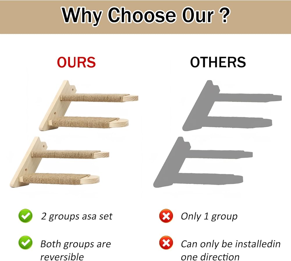 【MORE LARGE SIZE】Our cat wall steps use of split design, long 19", more longer that other cat stairs.Enables big cats to jump and play on it. Each Package Includes: 2 long board + 4 short boards (including jute rope) + 12 mounting screws + 4 wall screws + 1 manual. Complete with accessories to use with all wall constructions.
