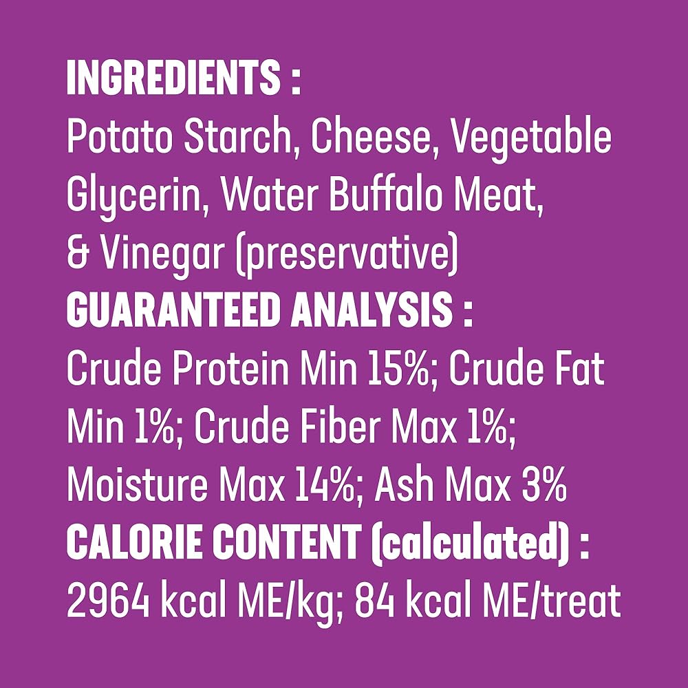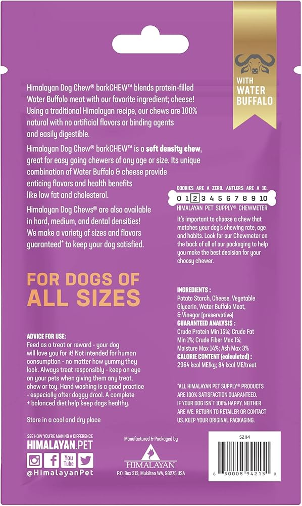 Himalayan Dog Chew barkCHEW is a soft density chew, great for easy going chewers of any age or size. These soft chews are made with all natural, nutrient-dense ingredients providing your dog with the chewy texture dogs crave, barkCHEWs are available in two unique, flavorful combinations of turmeric (with coconut & cheese) and water buffalo meat (with cheese). Like all Himalayan Pet Supply chews and treats, it starts with the cheese and originates from a generations old recipe of simple ingredients and a simple cooking and curing process that removes the lactose and creates a wholesome, nutritious treat It's important to choose a chew that matches your dog's chewing rate, age and habits. Check out our Chewmeter to help you make the best choice for your dog. You can find the Chewmeter on the back of all Himalayan Pet Supply packaging. Natural and easily digestible Limited ingredients Lactose, grain and gluten free Resealable bag keeps chews fresh Great for any age or size Advice for use: Give as reward or treat Supervise pets when giving them any treat Best for dogs over 12 weeks old Not for human consumption Chews will last longer if kept in a cool and dry place (do not refrigerate) Wash hands after handling products with dog drool Remove treat if potential hazard presents itself. Ingredients: Potato Starch, Cheese, Vegetable Glycerin, Water Buffalo Meat, & Vinegar (a preservative)