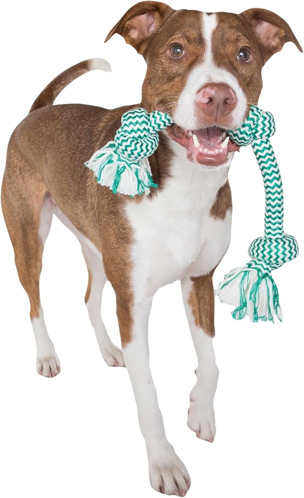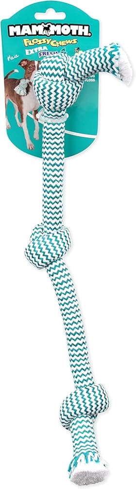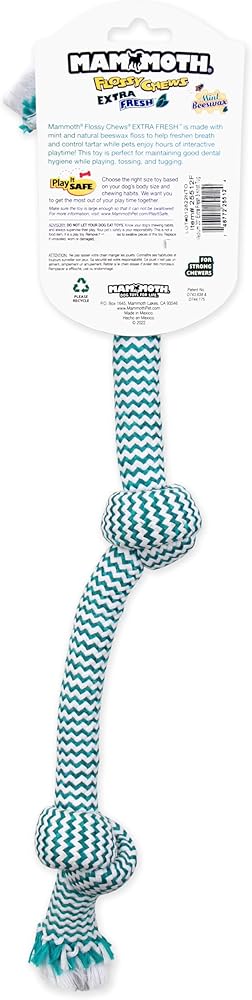 EXTRA FRESH TUG ROPE Mammoth Flossy Chews EXTRA rope toys are made from premium materials in fun shapes and colors dogs love. The outer core is made from a cotton-poly woven sheath and the inner core is made from cotton-poly woven fibers. EXTRA toys are tougher than our standard rope chews and made more durable for strong chewers. Rope fibers floss dogs teeth as they chew and play. TOSS, TUG & FLOSS Ideal for tug of war games with your pup, the rope used to make this interactive dog toy is stronger than regular rope, and the knotted rope toy's durable construction is perfect for pulling. The knotted ends make the dog rope easy to throw for games of fetch, and offer a great grip for humans during dog tug of war games. The rope tug design is also easy for your pet to toss, catch and carry. Along with being ideal for interactive play, these dog knot toys are also a safe dog chew toy for supervised solo play, keeping your pet busy and happy. Made from premium quality North American-USA-Mexico cotton-poly yarns, Mammoth Flossy Chews tug toys are safe and non-toxic. The rope dog toy's fibers with floss, floss your dogs' teeth as they chew and play, helping to freshen breath, and control plaque and tartar to maintain good dental hygiene. A great way to encourage playtime and bonding between you and your pet, Mammoth Pet dog toys are available in a range of sizes to suit different pet breeds and ages. For dogs considered to be ‘regular chewers', choose our Mini dog toys for dogs under 15 lbs., Small for 15-30 lbs., Medium for 30-50 lbs., Large for 50-80 lbs. and X-Large for over 80 lbs. We recommend choosing one size larger dog rope toys for aggressive chewers. MAMMOTH PET PRODUCTS We understand that pets are part of your family and that they require fun and engaging toys to keep them happy and active. We offer a large variety of interactive dog toys made using the highest consumer product standards, from mini toys for playful puppies to colossal and tougher toys for larger, more active chewers.