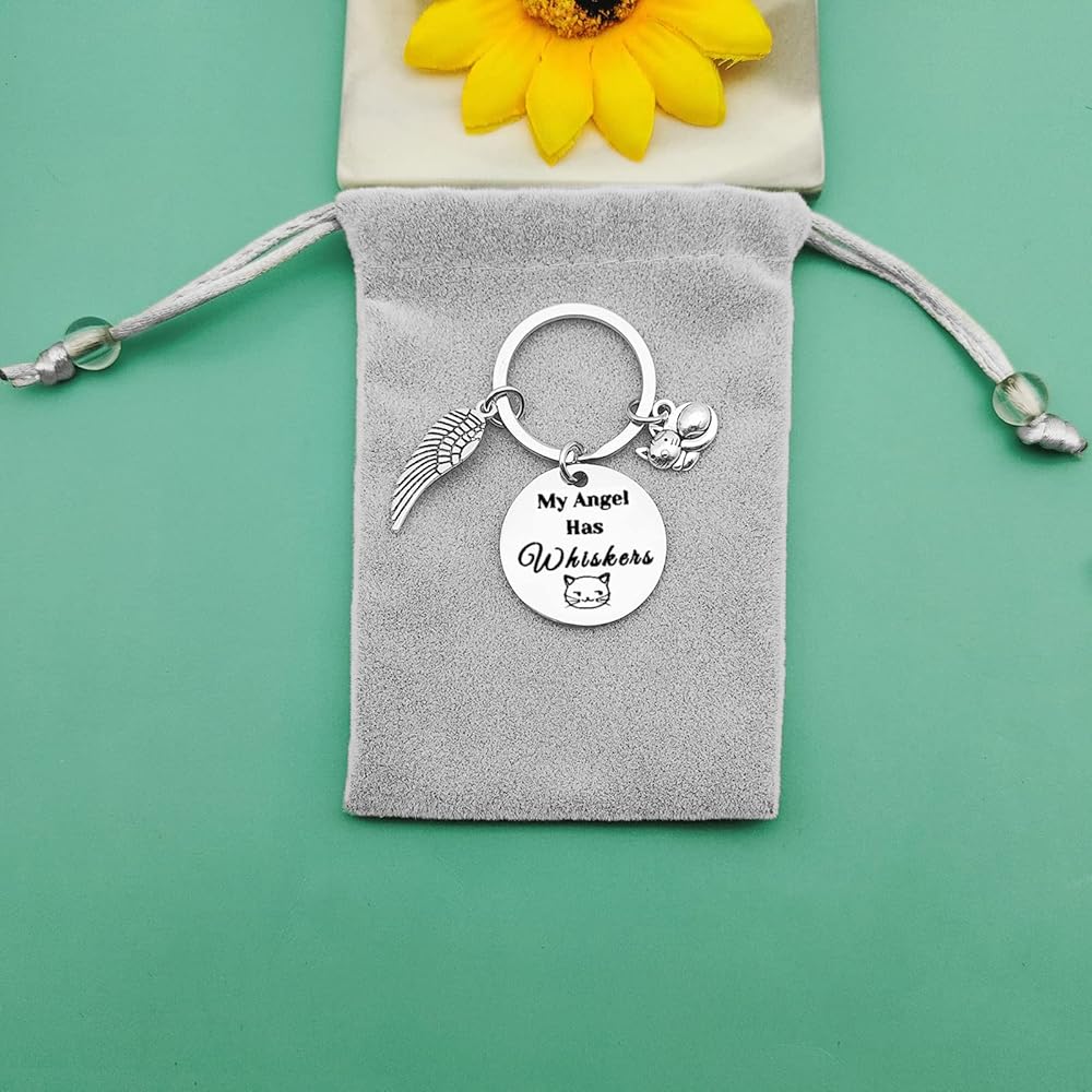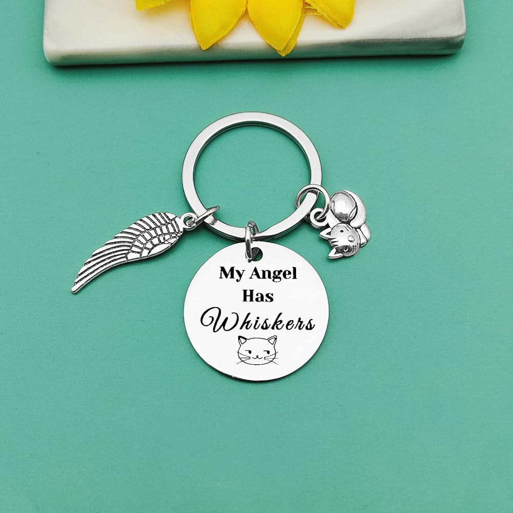 • Cat Memorial Gift : "My Angel Has Whiskers." The Memorial Keychain will a daily reminder of their dear pet friend who has crossed the rainbow bridge and will always be deeply loved and missed every day.