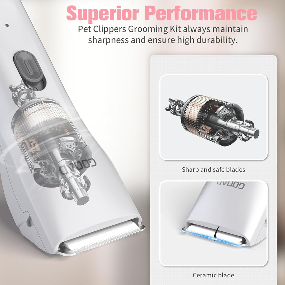 🐱GOOAD Cat Clippers and Cat Paw Trimmer Kit GOOAD pet clipper set keeps your pets always looking good, Complete new user friendly, it's very useful both in home and profession salon use! 2 double head limit combs, make haircut safe and easy. No more expensive bills for pet grooming, We hope our product will create an easier and happier experience both for you and your pet. 🐱USB Chargeable & Cordless Pet hair clippers will provide you and your pets with excellent cutting experience. Low noise working Pet clippers for Cats With below 60db noise,Helping the pet feel at ease, not afraid haircut any more. 🐱Paw Trimmers for Small Areas Perfect for trimming small parts of your pet, such as the face, PAWS, ears, eyes, nail and butt. 🐱NOTE: All accessories are underneath the case on the bottom. please check and confirm it, thanks so much. If your pets get long and thick hair, you need to use scissors cut shorter at first, otherwise, the clippers may jam up and don't work properly.