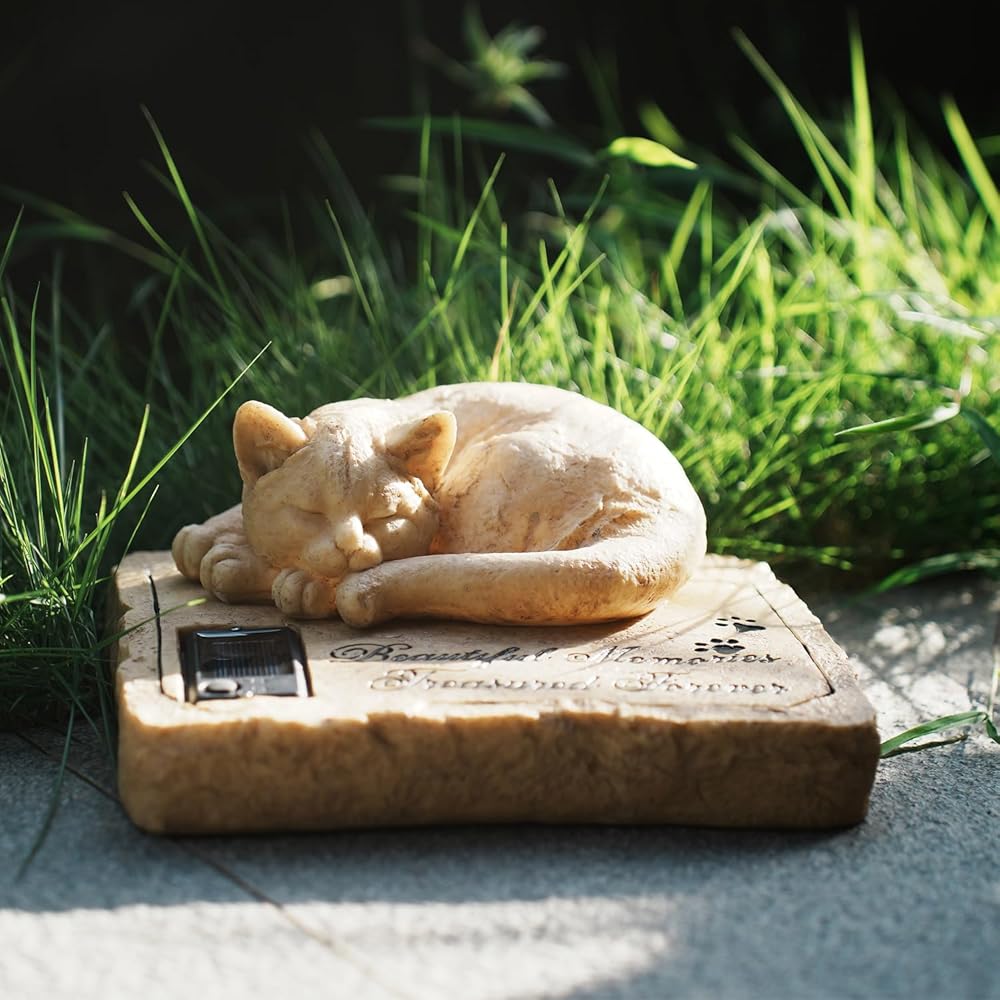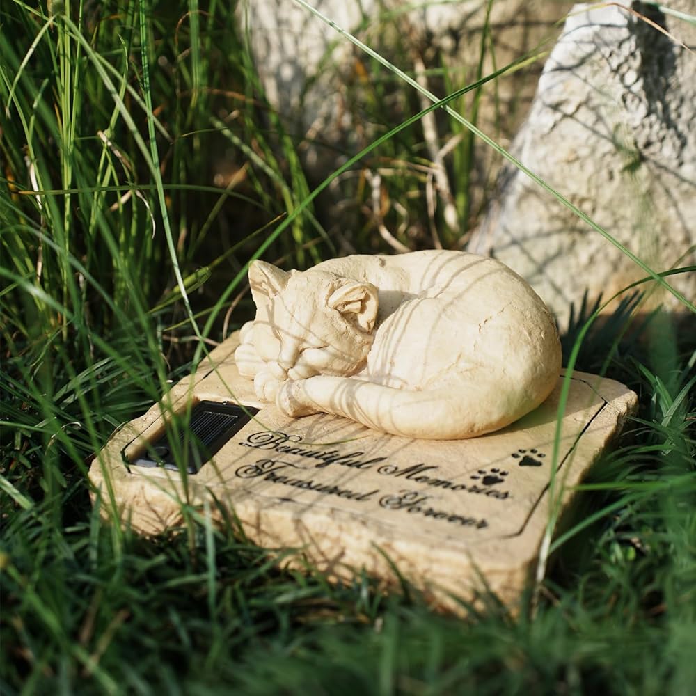 【Unique design】The Cat Memorial Stone is topped with a sleeping three-dimensional cat, a creative solar design, sympathetic paw prints, and the touching memorial poem。