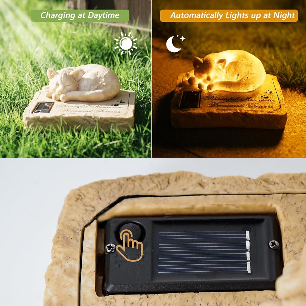 【Sparkling Romantic Light at Night】Pet memorial stone headstone will light up automatically at night or in dark environments. Place the Cat Loss Memorial Gift in the sun to ensure adequate sunlight, the solar panel will automatically recharge during the day and illuminate automatically for 8-10 hours at night. (Note: Please make sure to turn the solar panel switch "ON")