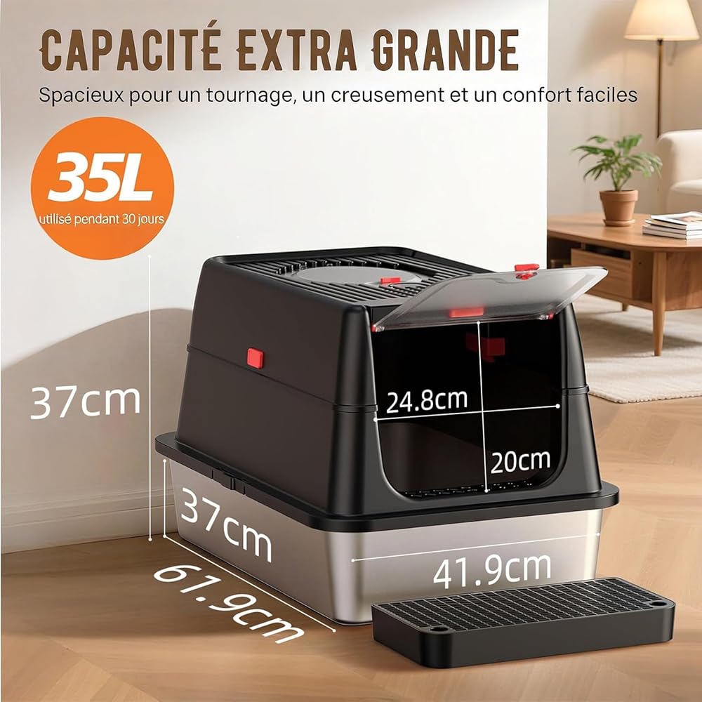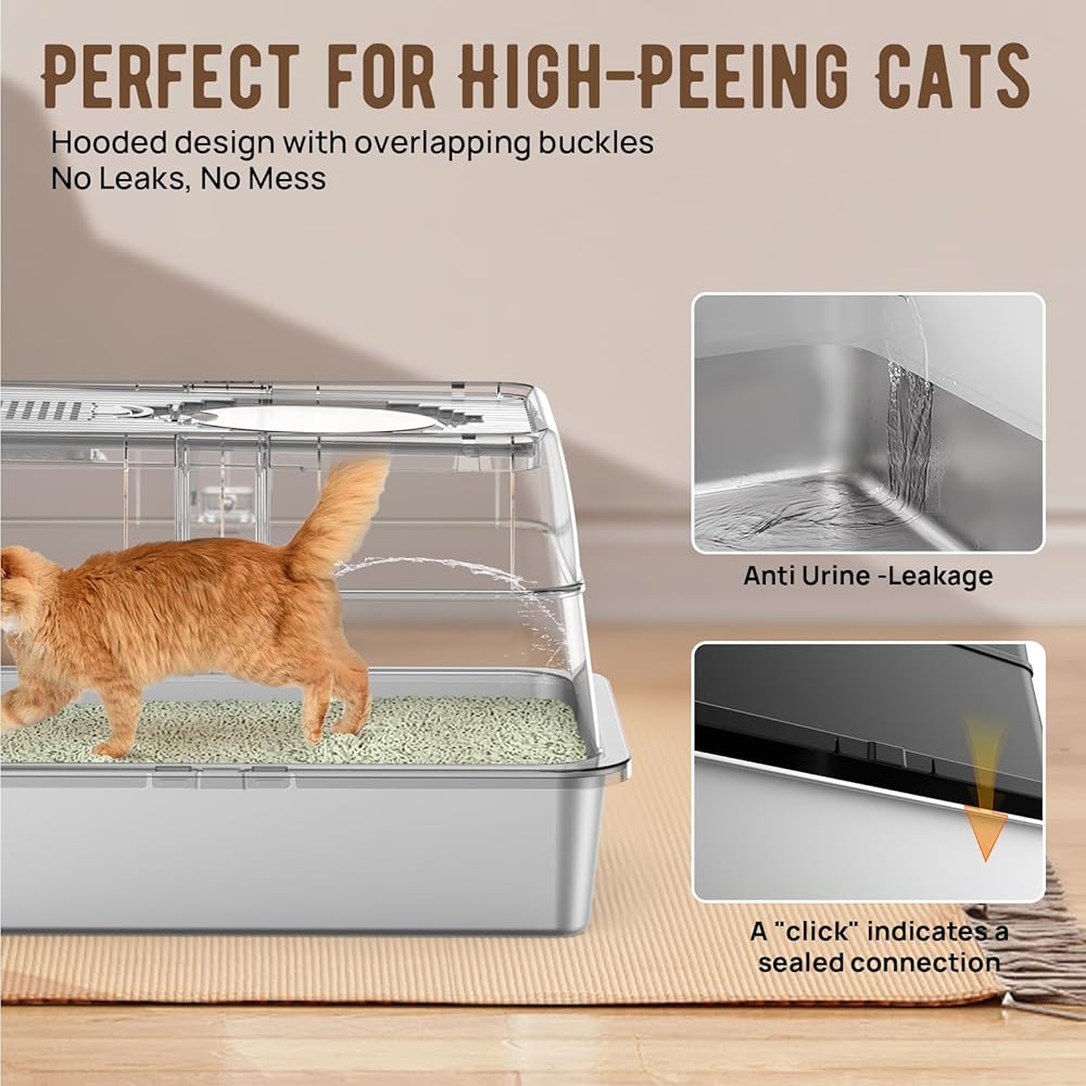 • 😺💟【3-Way Adjustable Metal Litter Box】Worried your cat won't use our top entry litter box? No need to worry! Investing this one adjustable metal litter box, getting 3-various-functions large kitty litter box, offers the perfect choice for cats of all ages. It features a stainless steel base, an enclosure, a top cover, and a front panel. Your cat enjoys security and easy access. Simply adjust by removing the lid or enclosure to suit your cat's preferences.