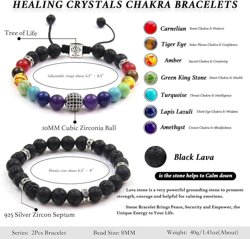 【Chakra Bracelets】Adjustable chakra bracelet includes amethyst, lapis lazuli, turquoise, green king stone, amber, tigers eye, red agate seven energy healing crystals corresponding to the 7 chakras of the human body. Chakras are the energy centers of life, wearing chakra bracelets brings balance, they eliminate negative energy and allow you to re-establish physical and mental health and harmony.