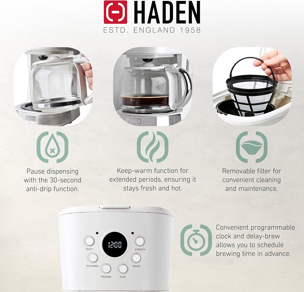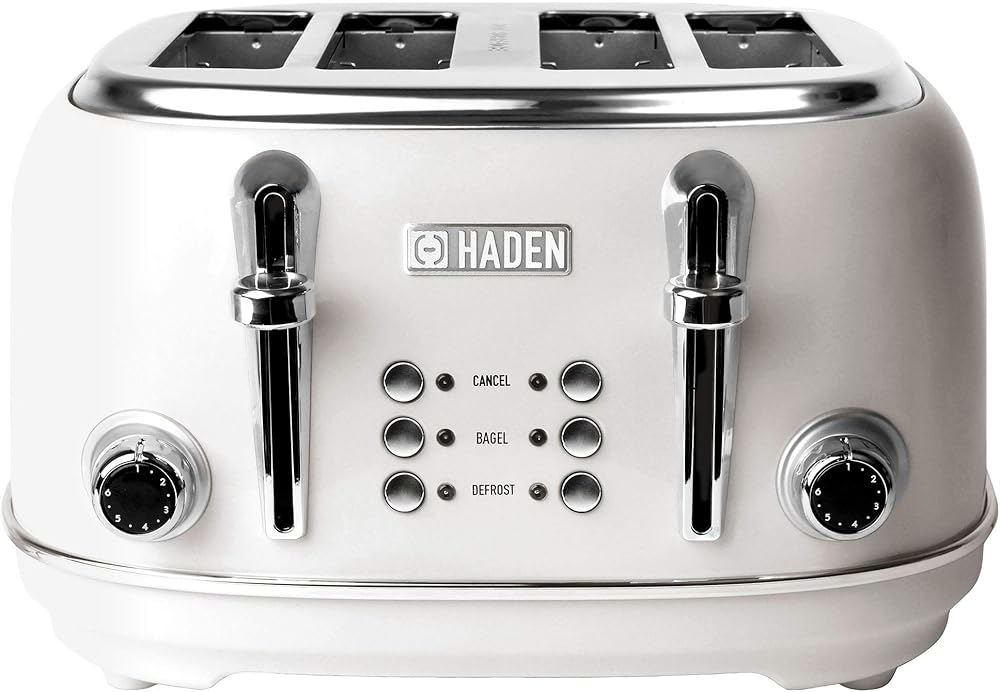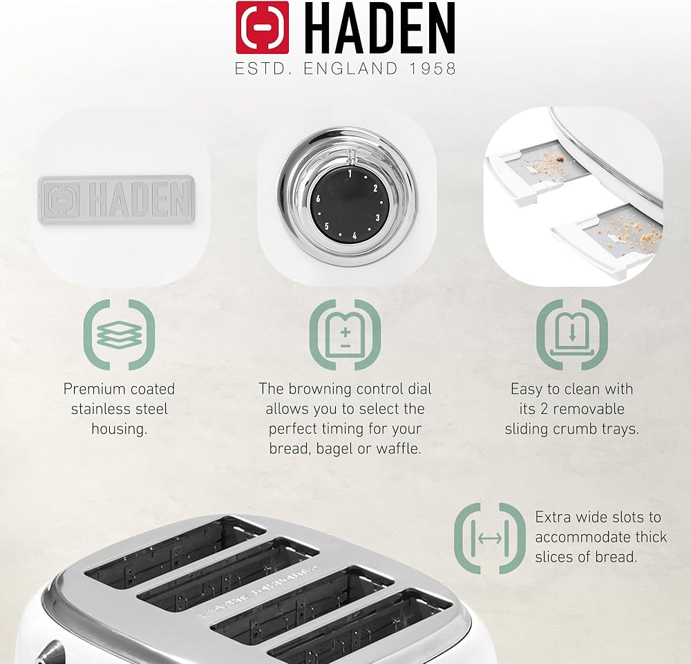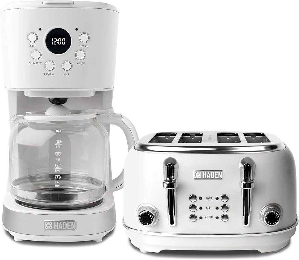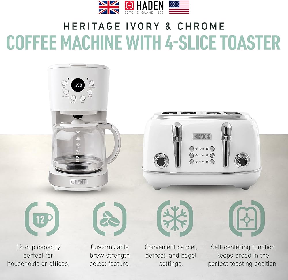 Brighten up your morning routine with the Haden Heritage series, featuring the 4-Slice Wide Slot Toaster and the 12-Cup Programmable Coffee Maker. These retro-chic appliances combine classic design with cutting-edge technology to enhance your kitchen and simplify your breakfast preparations. The Heritage 4-Slice Wide Slot Toaster offers multiple settings to ensure your toast or bagels are browned exactly to your liking. Its cancel setting lets you stop the toasting cycle midway, while the self-centering function automatically adjusts bread for perfect results. With extra-wide slots, this versatile toaster can accommodate a variety of breakfast foods, including thick-cut bread, bagels, buns, and crumpets. Designed for convenience, it includes reheat, defrost, and bagel functions, and an anti-jam feature for easy toast removal. Experience power, efficiency, durability, and great design every morning. Complementing the toaster, the Heritage 12-Cup Programmable Coffee Maker ensures you start your day with a steaming mug of your favorite brew. Despite its vintage look, this coffee maker boasts modern features, including programmable functions to select your desired brew strength and timing. The 30-second anti-drip function allows you to pause dispensing, and the machine automatically deactivates after 120 minutes. The glass carafe can prepare up to 12 cups of coffee, and the washable water filter ensures long-lasting use. Together, the Haden Heritage 4-Slice Wide Slot Toaster and 12-Cup Programmable Coffee Maker bring retro flair and modern functionality to your kitchen, making every morning a delightful experience.
