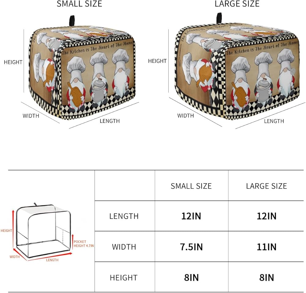 WIDE APPLICATION & SIZE: Two sizes are available of our bread toaster cover. S:12x7.5x8in, this size is for standard 2 slice toast oven. M: 12x11x8in, this size is for standard 4 slice toast oven. Please measure your toaster oven before you buy.There is 1 piece Bread machine cover (only the cover is included, others are not included) in the package.