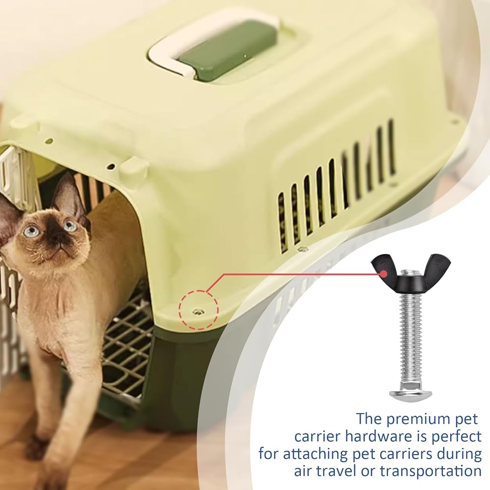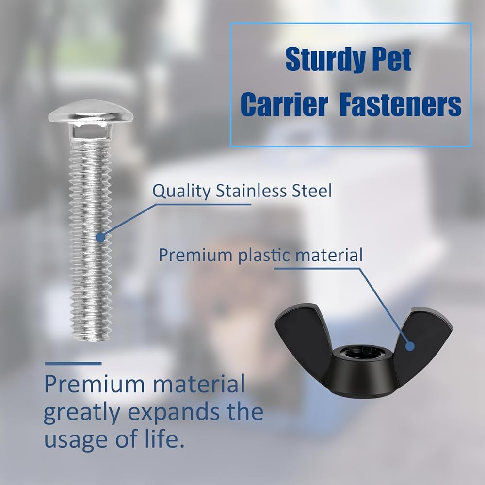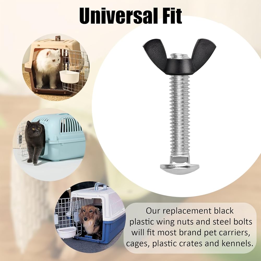 Our replacement black wing nuts and iron steel bolts will fit all Petmate brand pet carriers, cages, plastic crates and kennels including Sky Kennel, Vari Kennel, Petco, Pet Taxi, Bargain Hound, Grreat Choice, Travel Aire, Remington, Rover, Kennel Aire, PlastiCrate, Ruff Tuff and any plastic pet crate that has holes for carrier bolts and wing nuts. Just be sure to measure your bolt length and diameter and count the holes before placing an order.