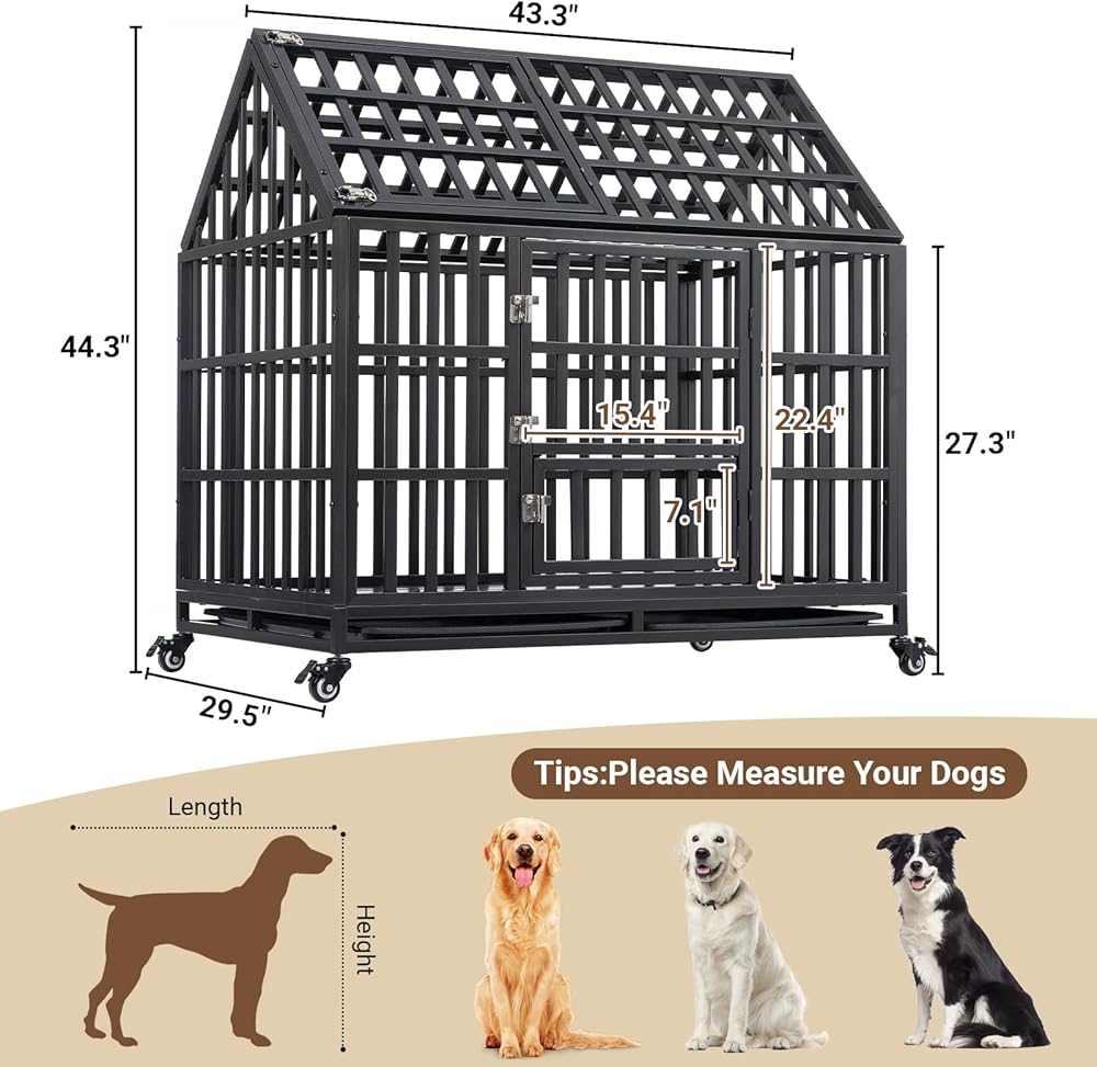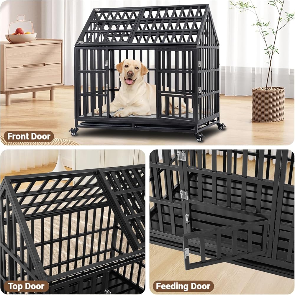 Rovibek Heavy Duty Dog Crate for Large Medium Dogs, 43 Inch, Indestructible Dog Crates with Trays, Feeding Door, High Anxiety Dog Cage, Dog Kennel Indoor with Lockable Wheels, Escape Proof