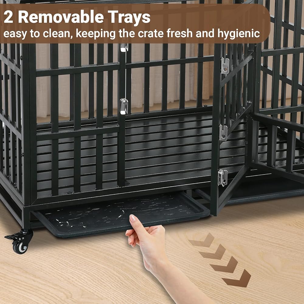 [ Simple Cleaning & Mobility ] This large dog cage features two washable plastic trays, making cleanup hair and food a breeze. Plus, with four lockable 360-degree wheels, you can effortlessly move this heavy-duty dog crate between rooms, ensuring it stays exactly where you need it.