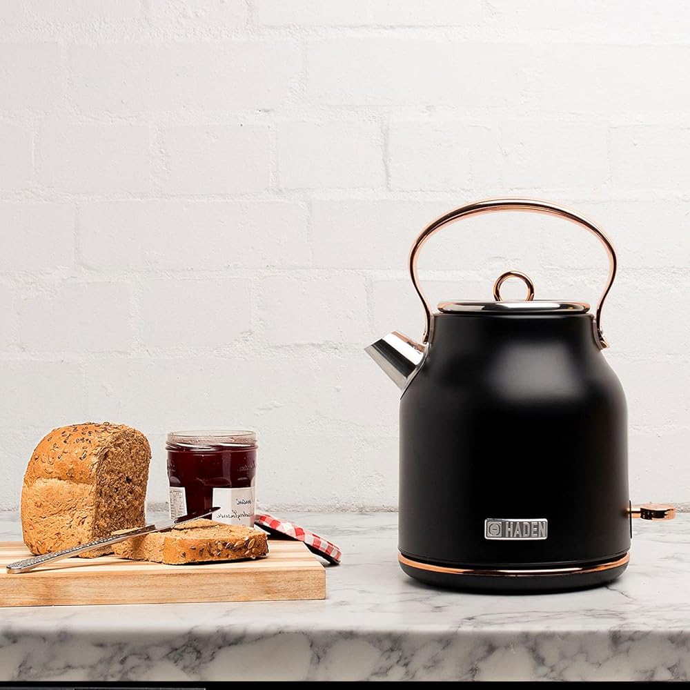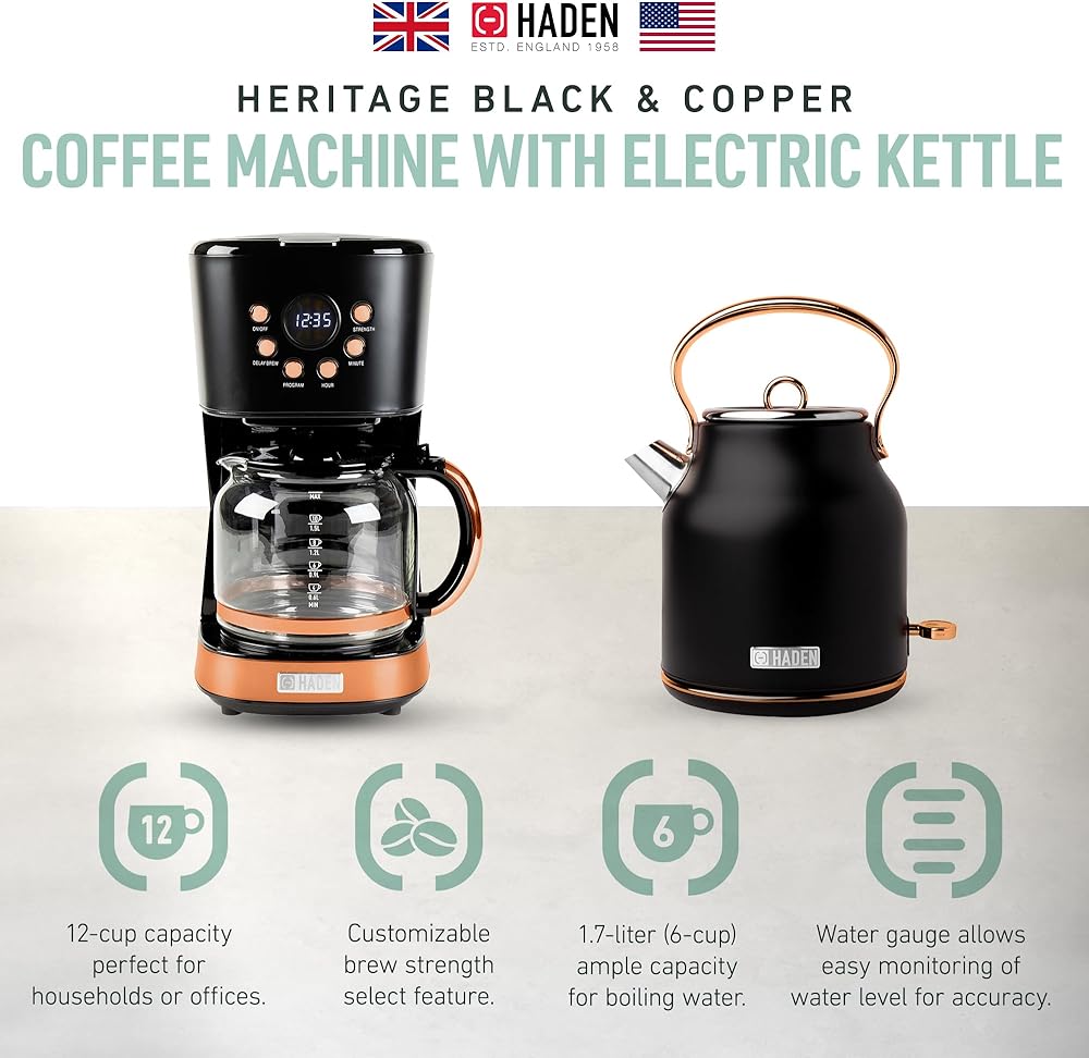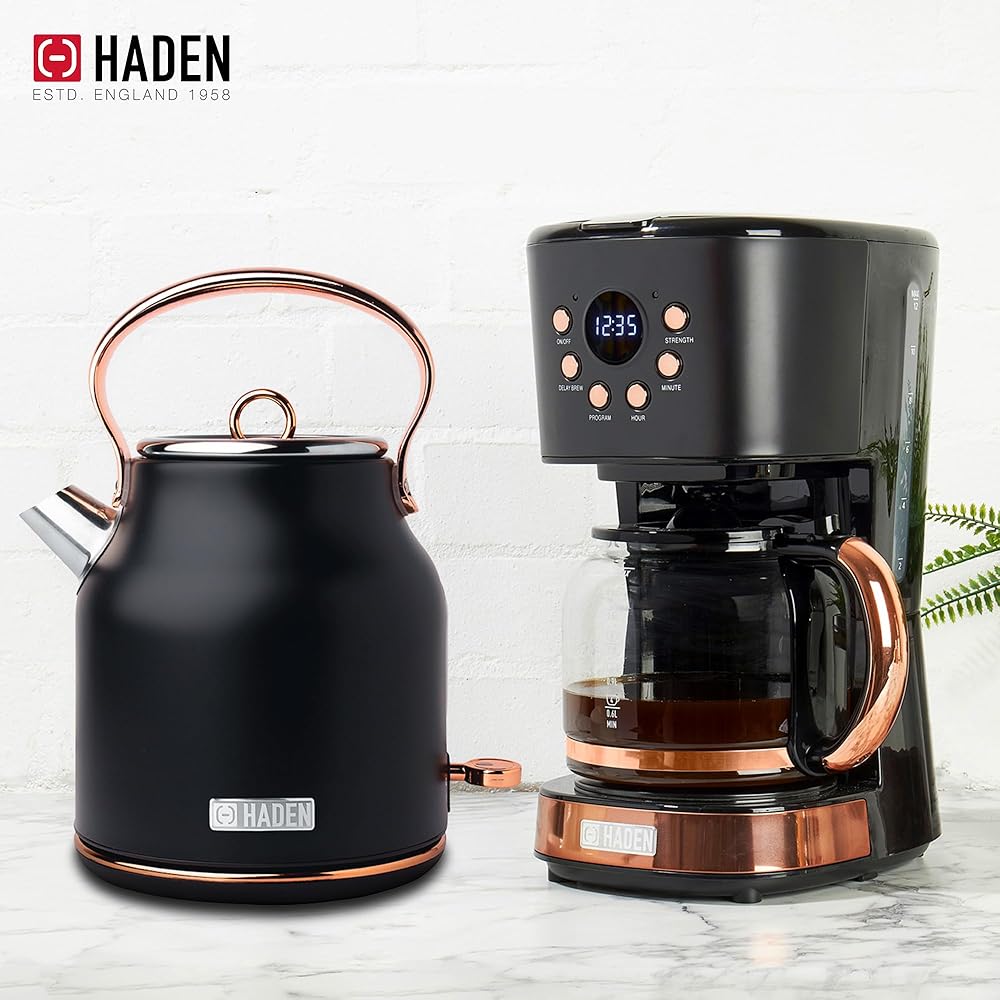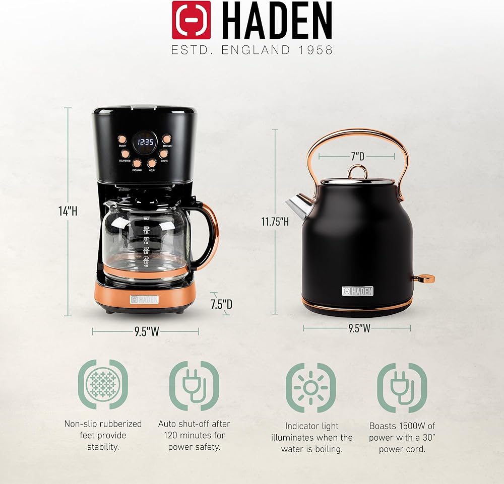 Brighten up your morning routine with a steaming mug of your favorite brew with the Haden 1.7L Electric Kettle and 12 Cup Coffee Maker Machine Kitchen Appliance Set. The 1.7-liter stainless steel body retro electric kettle is ideal for boiling water for tea, coffee, hot chocolate, and other warm beverages. The kettle's sleek and sturdy stainless steel housing can hold up to 1.7 liters of water, equivalent to 7 cups. The 360-degree base ensures stability and eliminates spills, while the indicator light lets you know when the water is fully boiled. The auto shut-off feature provides peace of mind if you forget to turn the kettle off. Paired with the coffee maker, this coffee maker lets you brew up to 12 cups of your favorite coffee with ease. Despite its vintage appearance, this machine is equipped with modern features like programmable functions, allowing you to select the desired strength and timing of your brew. The 30-second anti-drip feature lets you pause dispensing, and the machine automatically shuts off after 120 minutes to ensure safety. The included glass carafe and washable water filter mean you can enjoy your coffee maker for years to come. Make your breakfast a delightful experience with the 1.7L Electric Kettle and 12 Cup Coffee Maker Machine Kitchen Appliance Set from Haden, where classic design meets cutting-edge technology.