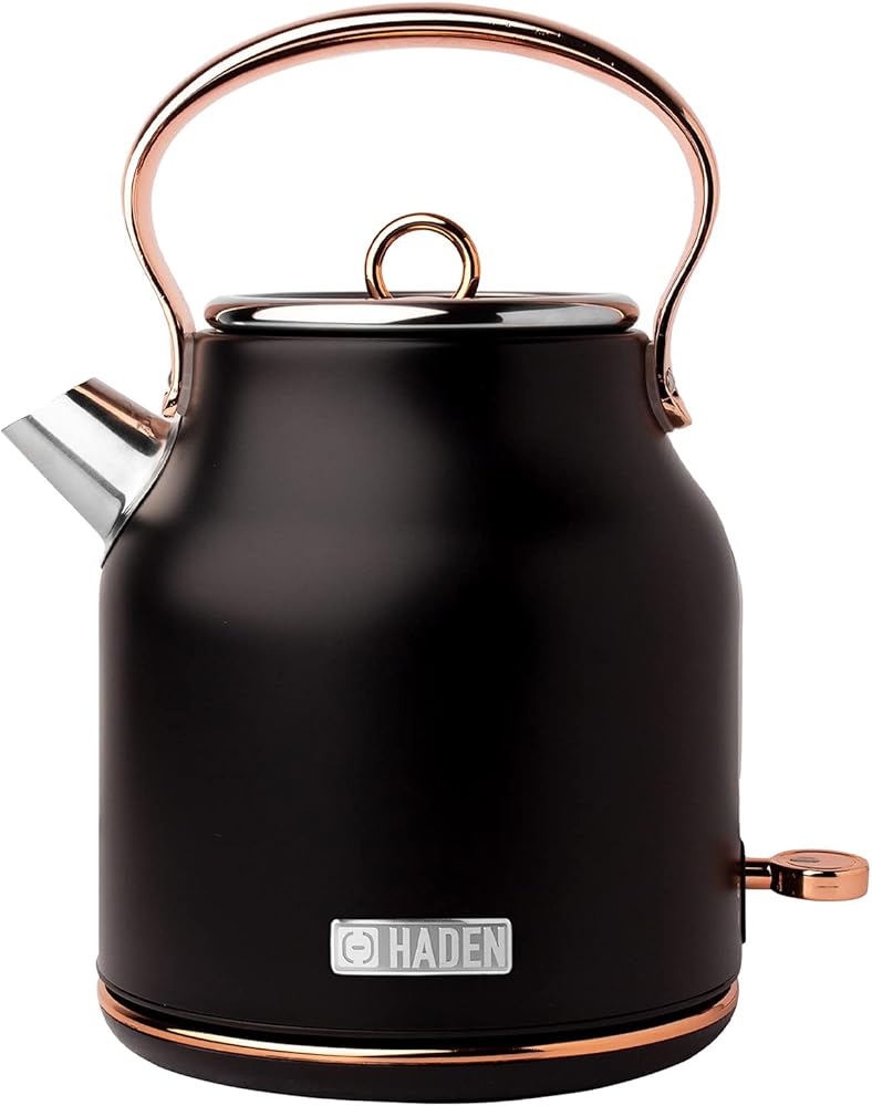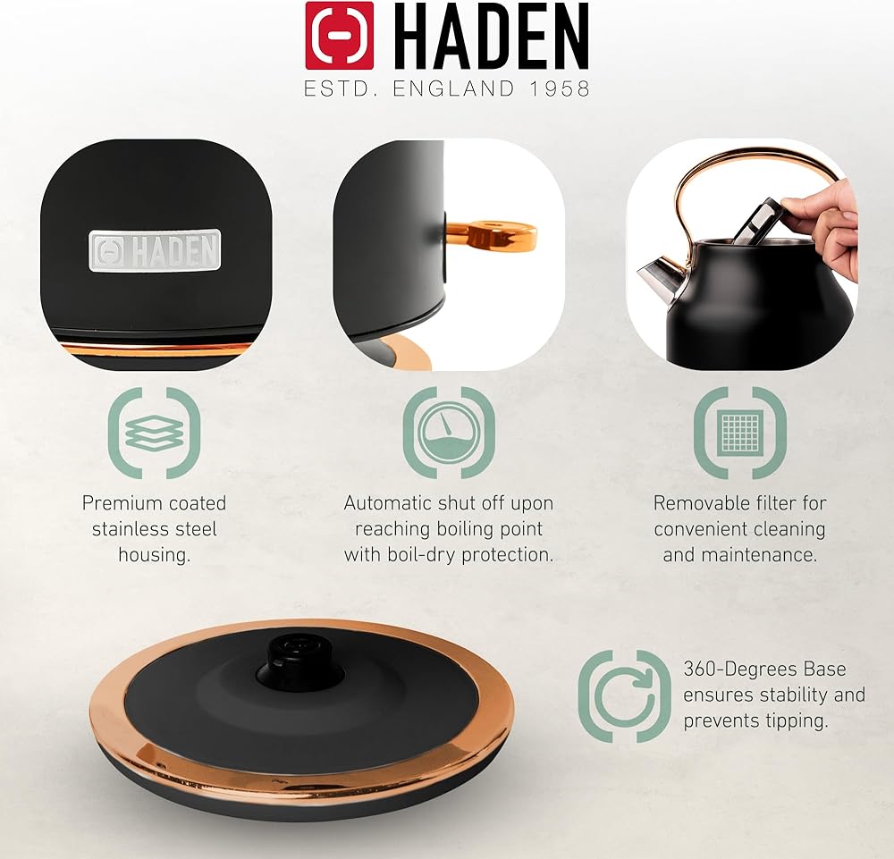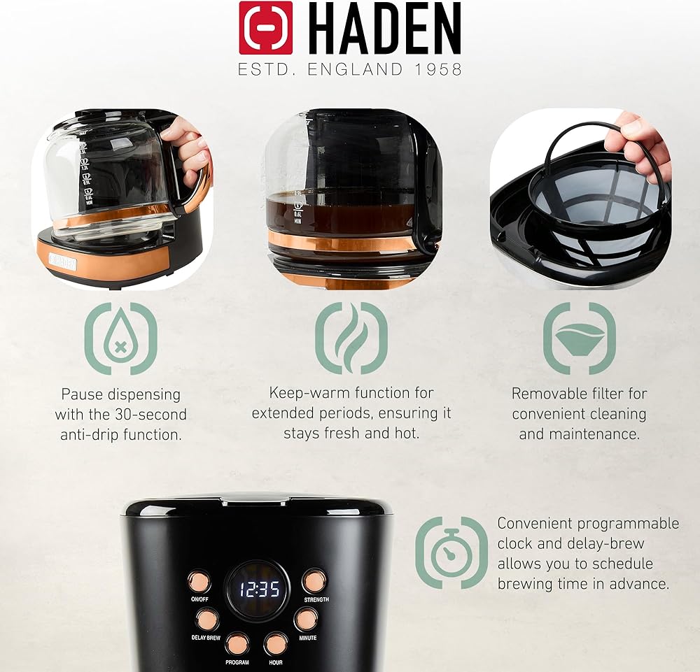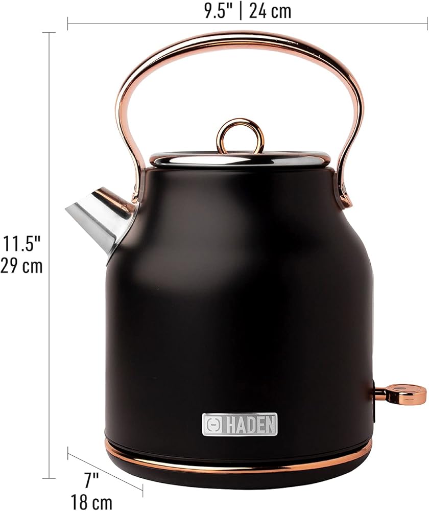 Brighten up your morning routine with a steaming mug of your favorite brew with the Haden 1.7L Electric Kettle and 12 Cup Coffee Maker Machine Kitchen Appliance Set. The 1.7-liter stainless steel body retro electric kettle is ideal for boiling water for tea, coffee, hot chocolate, and other warm beverages. The kettle's sleek and sturdy stainless steel housing can hold up to 1.7 liters of water, equivalent to 7 cups. The 360-degree base ensures stability and eliminates spills, while the indicator light lets you know when the water is fully boiled. The auto shut-off feature provides peace of mind if you forget to turn the kettle off. Paired with the coffee maker, this coffee maker lets you brew up to 12 cups of your favorite coffee with ease. Despite its vintage appearance, this machine is equipped with modern features like programmable functions, allowing you to select the desired strength and timing of your brew. The 30-second anti-drip feature lets you pause dispensing, and the machine automatically shuts off after 120 minutes to ensure safety. The included glass carafe and washable water filter mean you can enjoy your coffee maker for years to come. Make your breakfast a delightful experience with the 1.7L Electric Kettle and 12 Cup Coffee Maker Machine Kitchen Appliance Set from Haden, where classic design meets cutting-edge technology.
