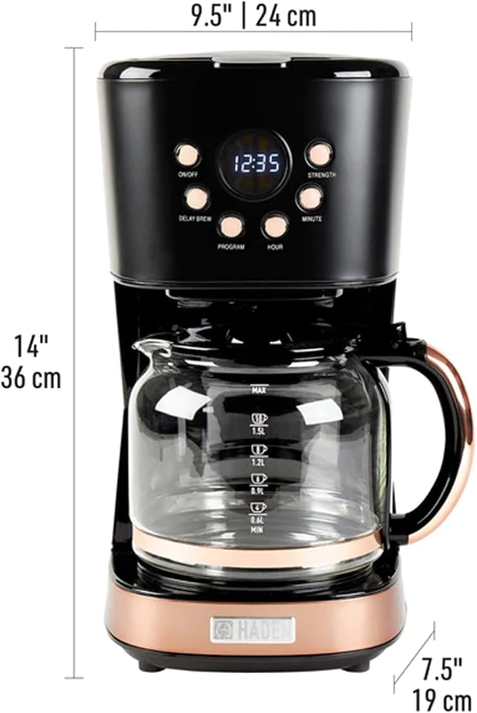 Coffee Maker Features: Brew up to 12 cups with programmable functions, select your desired strength, and keep your coffee warm with the included glass carafe and washable water filter